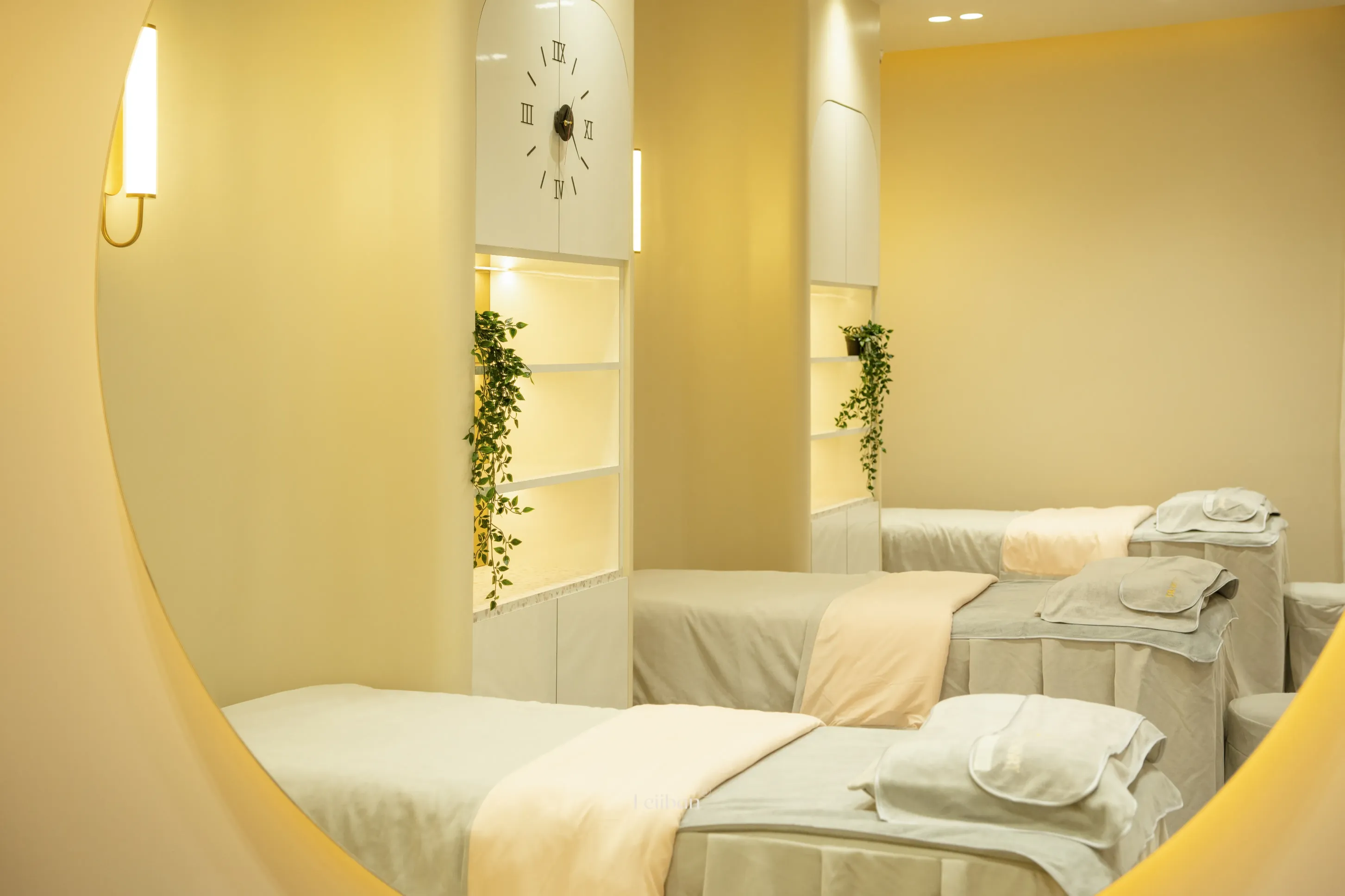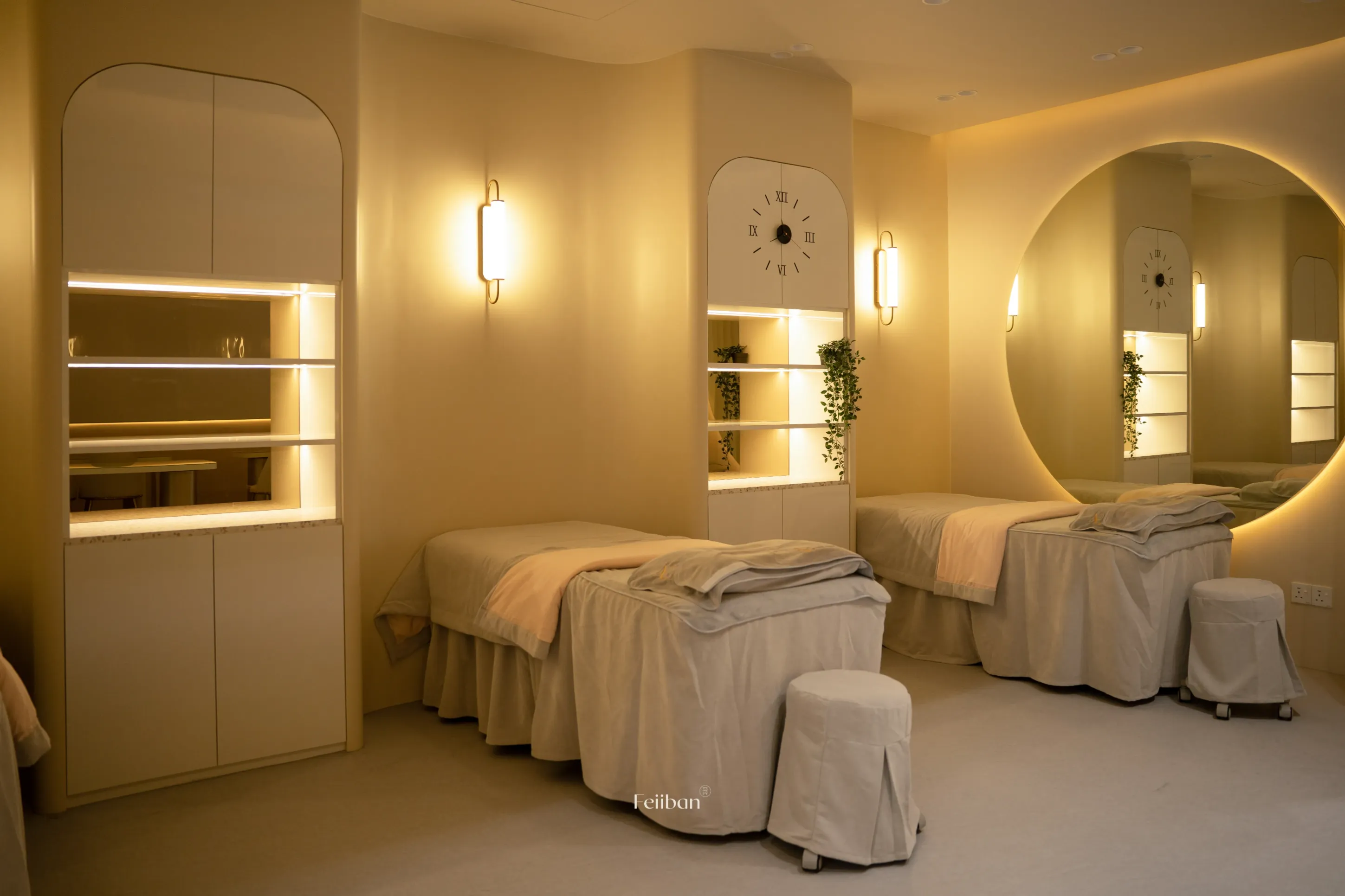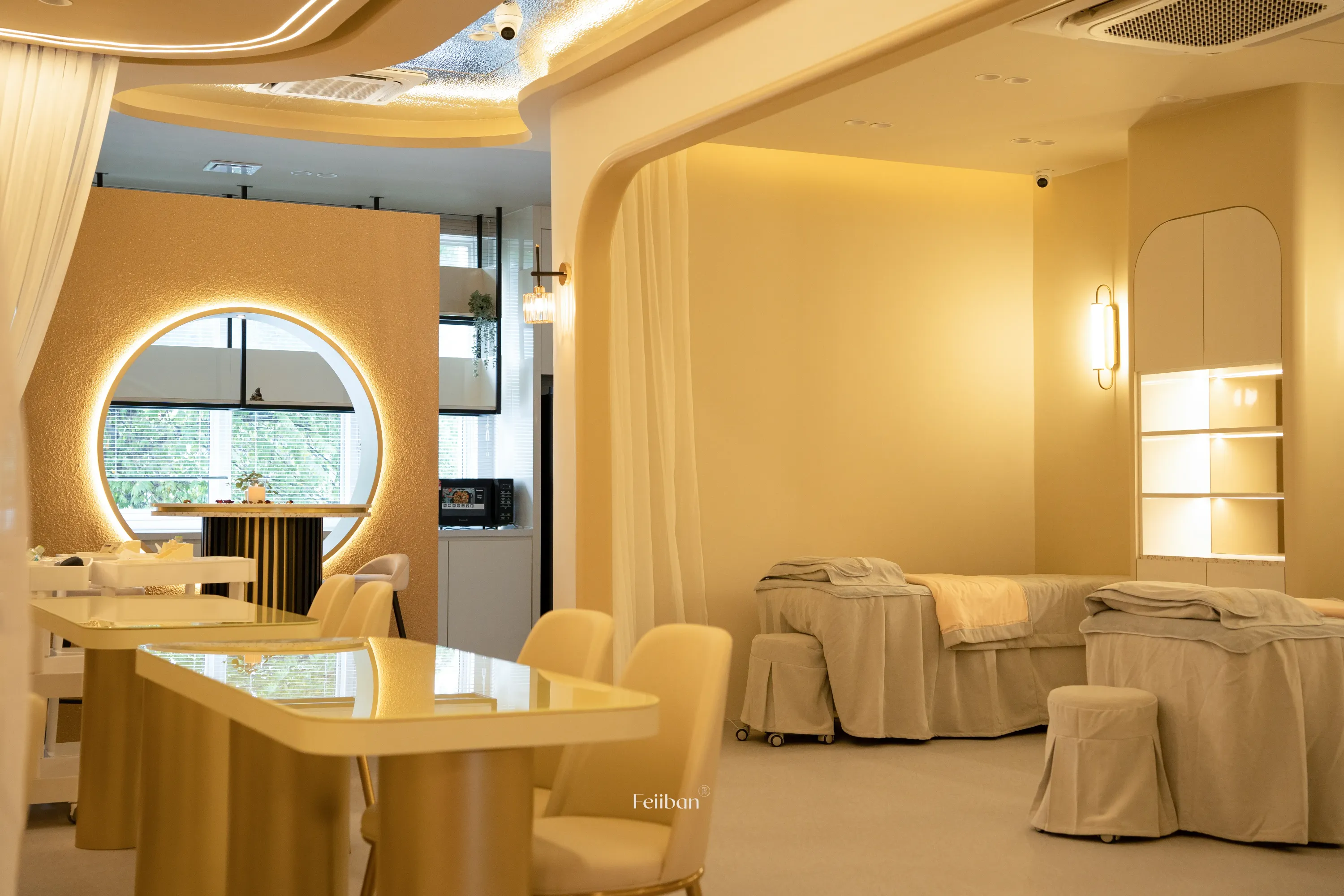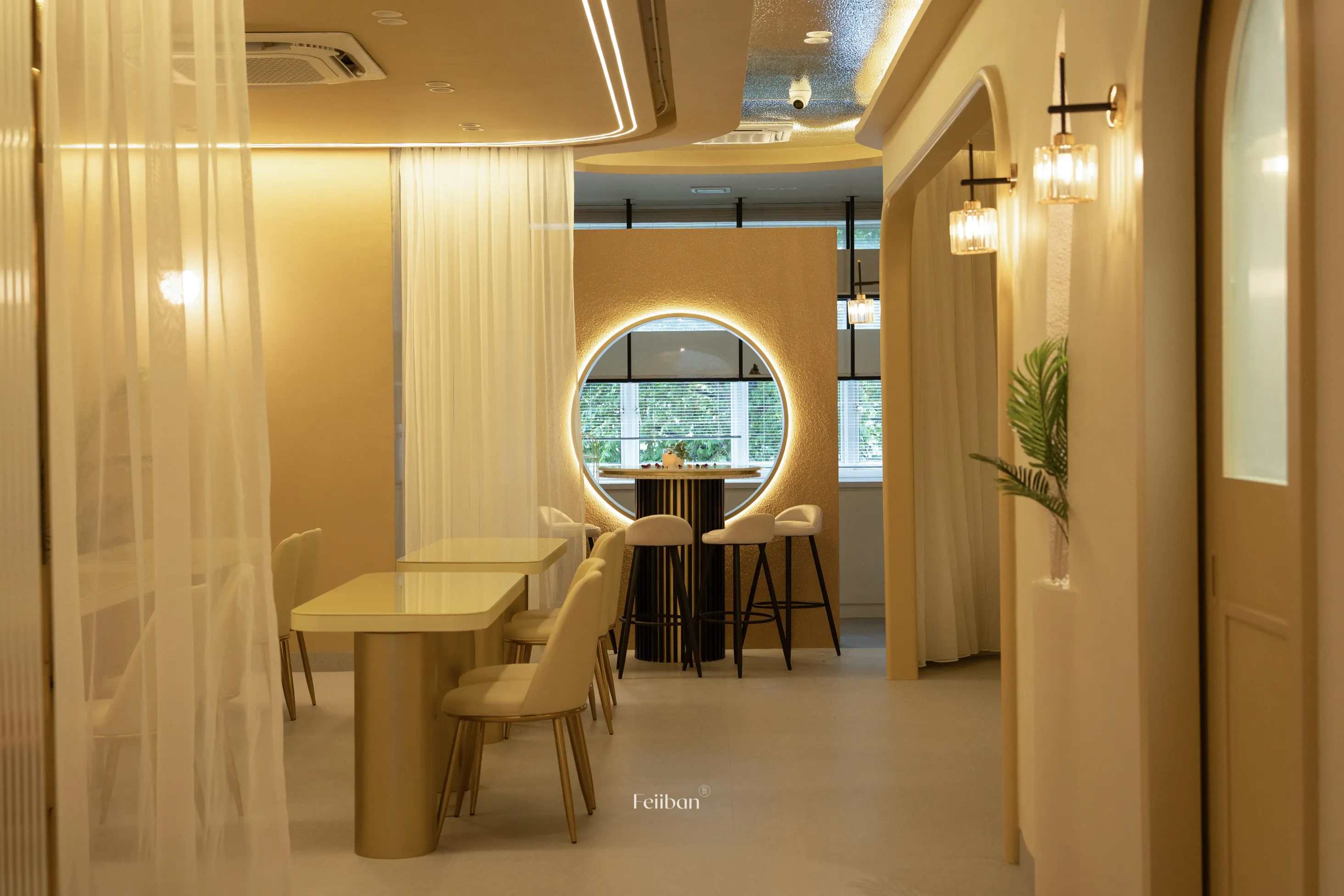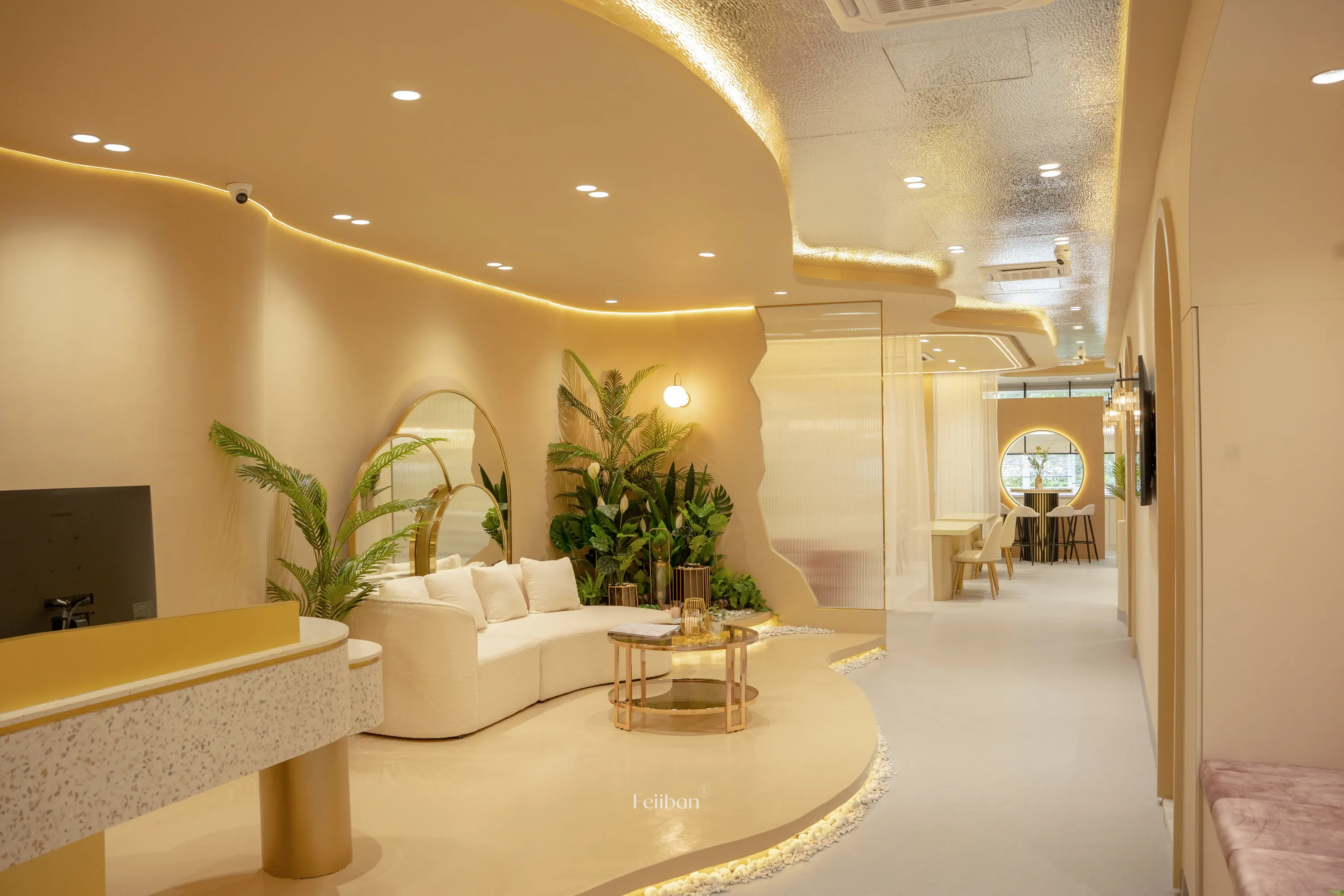 Elegant, free-flowing curves and hard materials are used in a symmetrical way to structure the space. The warm tones add to the overall comfort and ease of the space, allowing the consumer to feel more relaxed during long stays.