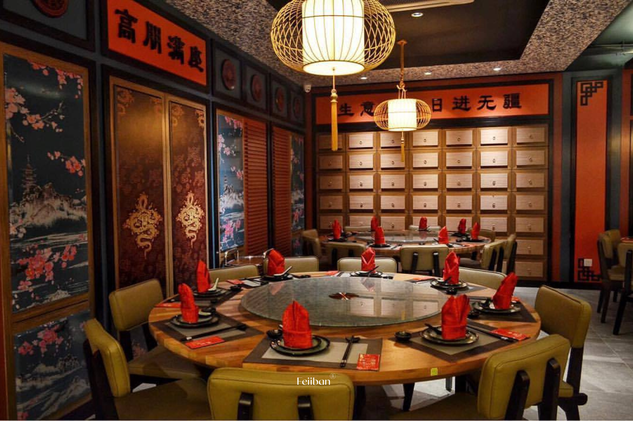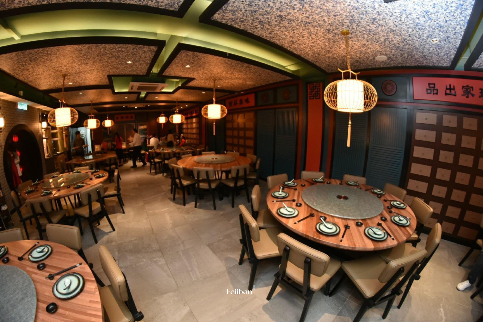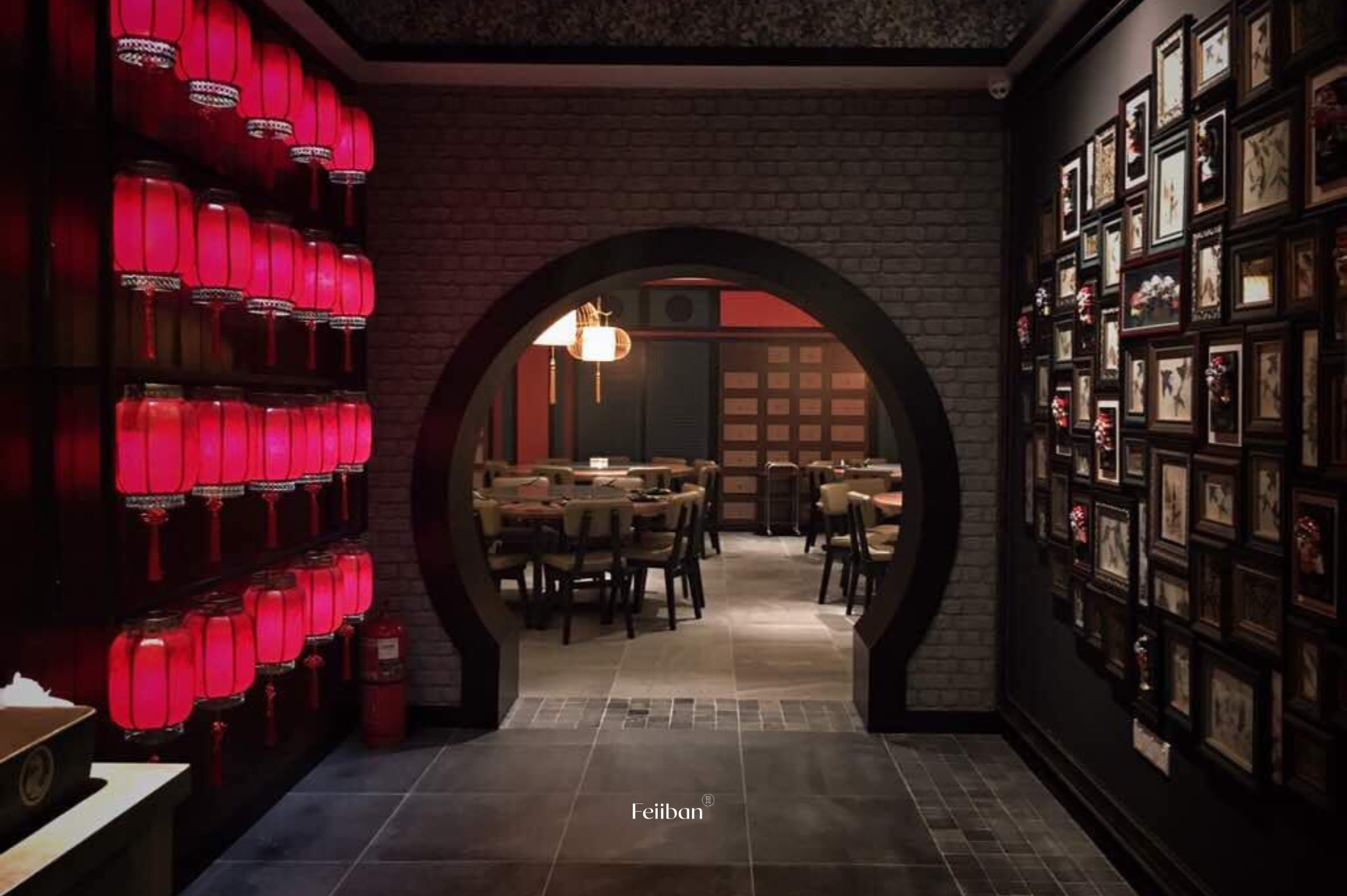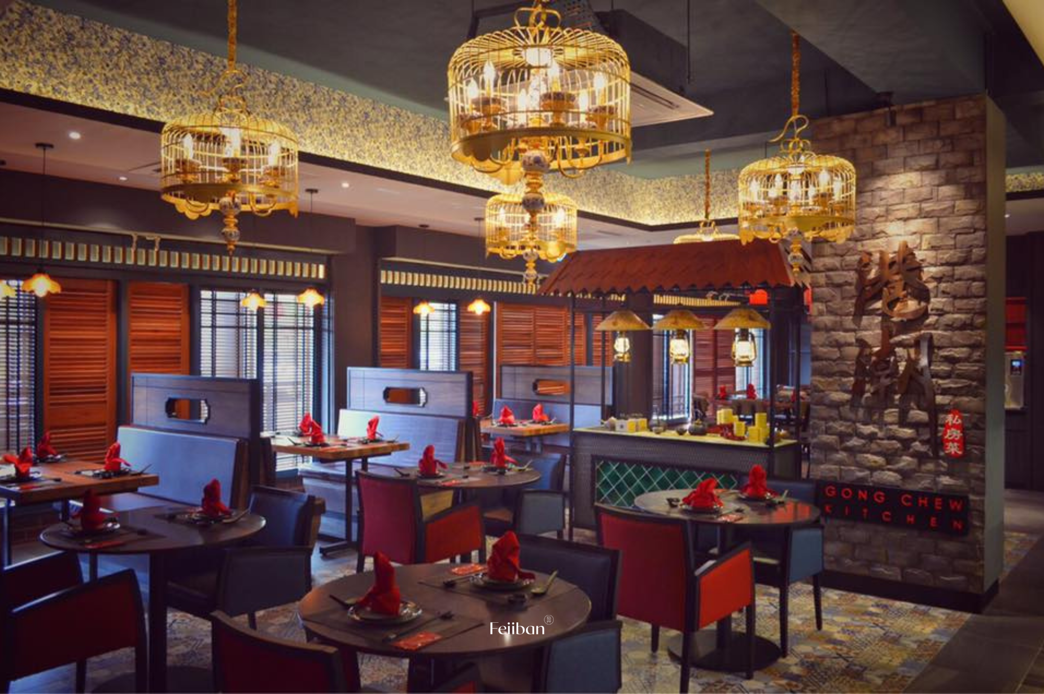 Gong Chew Kitchen, a Cantonese cuisine restaurant. The design style of this establishment embodies classic Chinese elegance, nobility, and opulence. The layout includes a dining area, banquet hall, and VIP room. The primary color scheme revolves around black and red, while the banquet hall incorporates Chinese lanterns on each round table and features a grid design on the ceiling.
