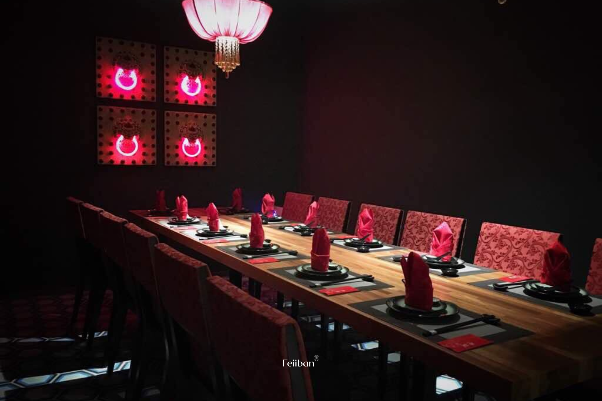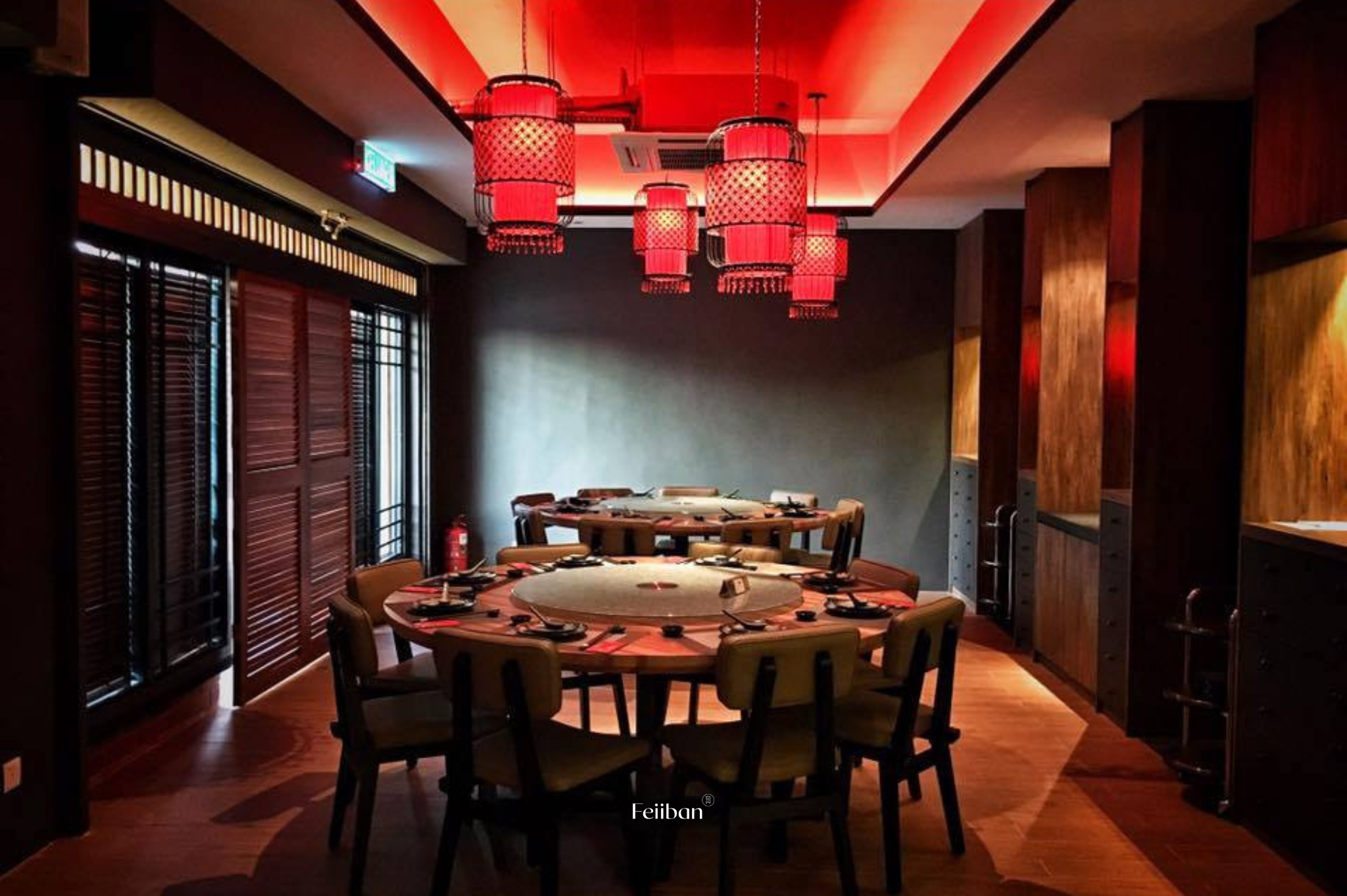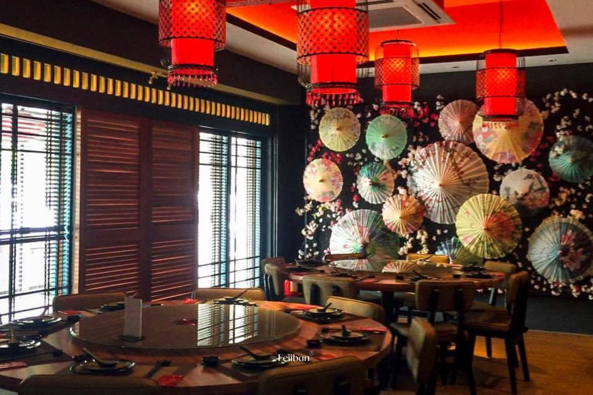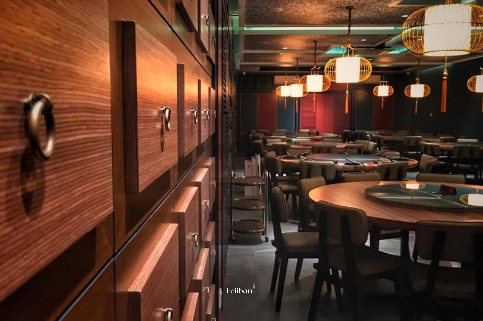Gong Chew Kitchen, a Cantonese cuisine restaurant. The design style of this establishment embodies classic Chinese elegance, nobility, and opulence. The layout includes a dining area, banquet hall, and VIP room. The primary color scheme revolves around black and red, while the banquet hall incorporates Chinese lanterns on each round table and features a grid design on the ceiling.