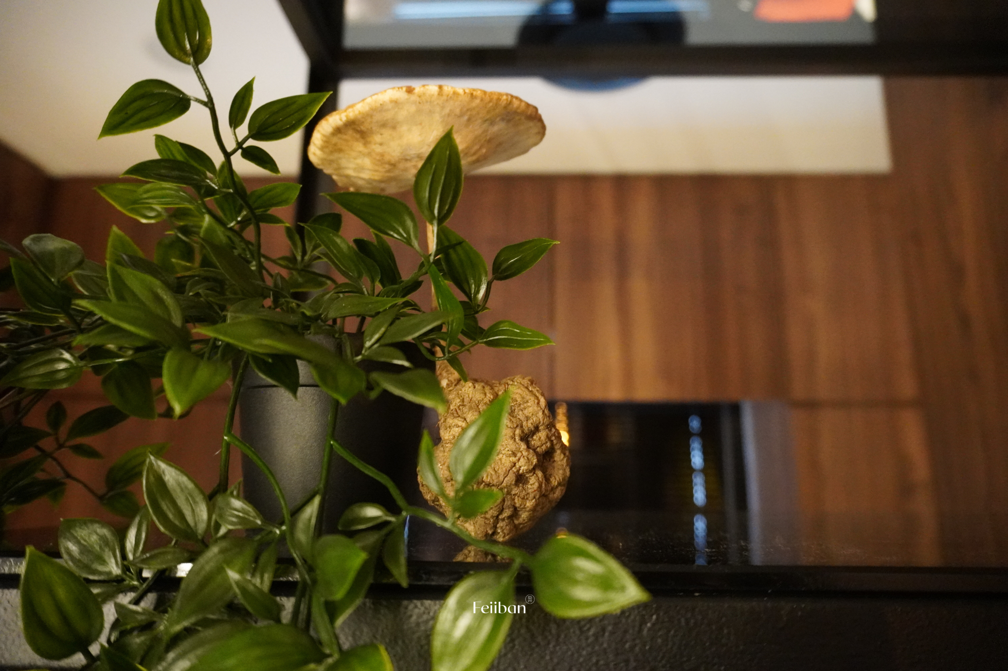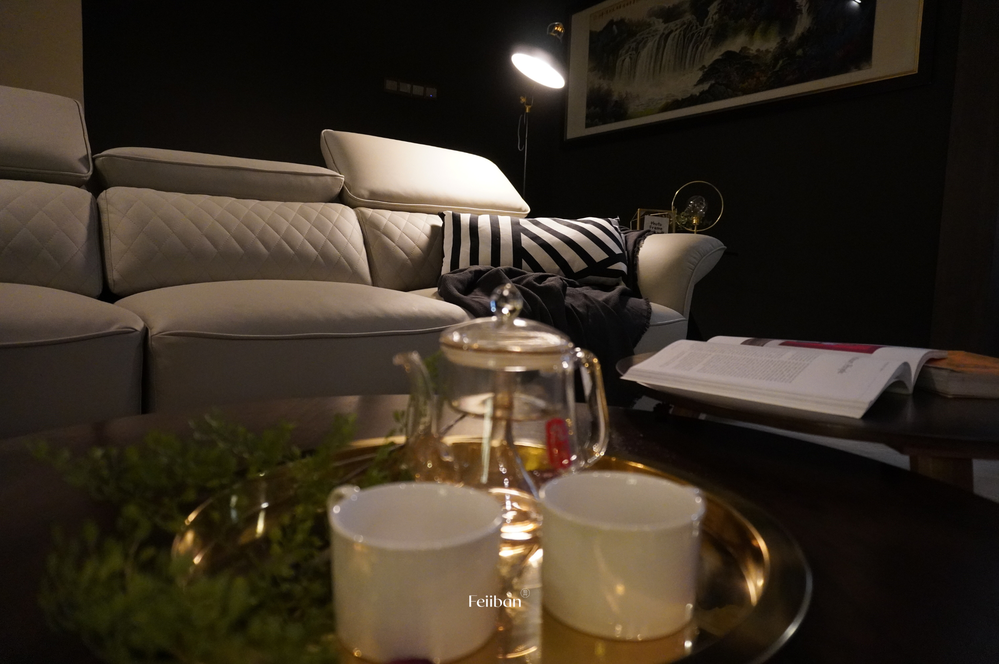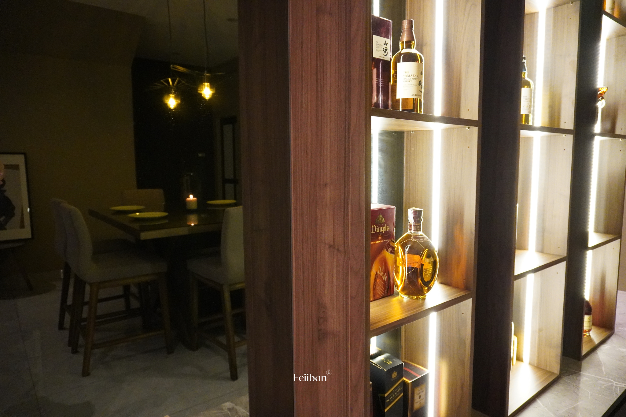 This modern and sophisticated home boasts a serene and dignified atmosphere with a dark earthy color scheme and stone pattern tiles on the TV wall. The living room features ample space for relaxation with a large L-shaped sofa and matching cushioned chairs, while a massive black and white artwork adds artistic elegance. The kitchen is a unique combination of industrial and wooden elements. The home also features a modern and atmospheric wooden wine cabinet, adding a touch of warmth and nature to the decor.