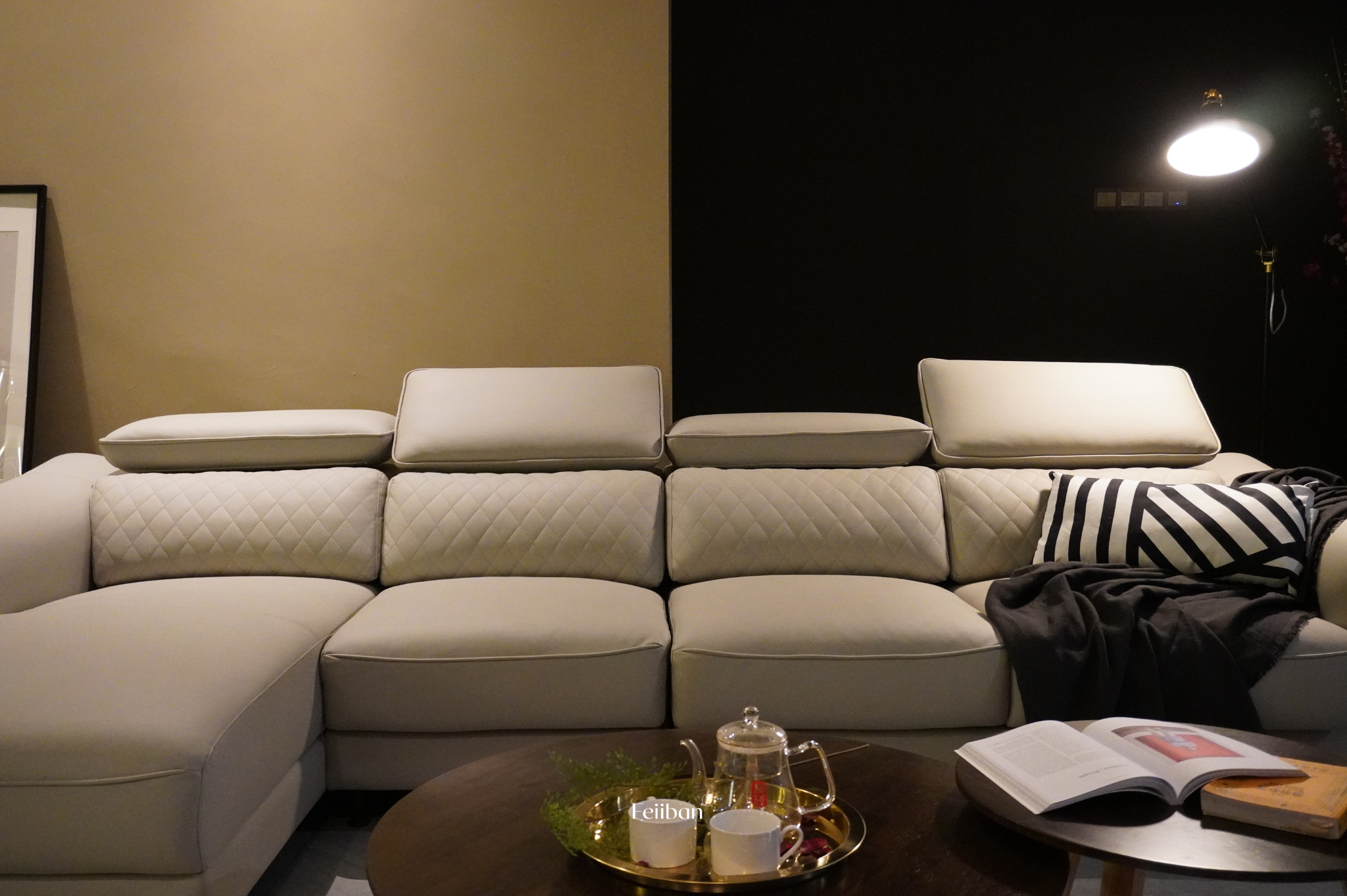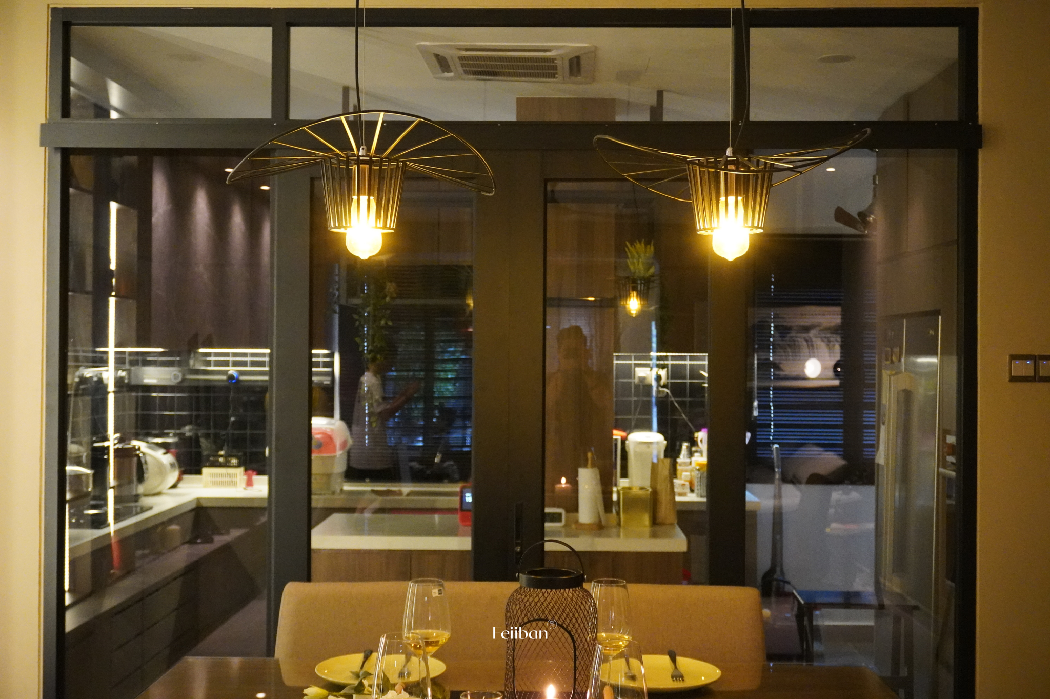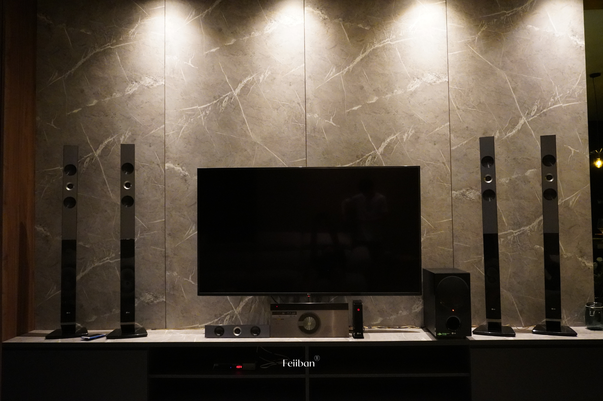 This modern and sophisticated home boasts a serene and dignified atmosphere with a dark earthy color scheme and stone pattern tiles on the TV wall. The living room features ample space for relaxation with a large L-shaped sofa and matching cushioned chairs, while a massive black and white artwork adds artistic elegance. The kitchen is a unique combination of industrial and wooden elements. The home also features a modern and atmospheric wooden wine cabinet, adding a touch of warmth and nature to the decor.