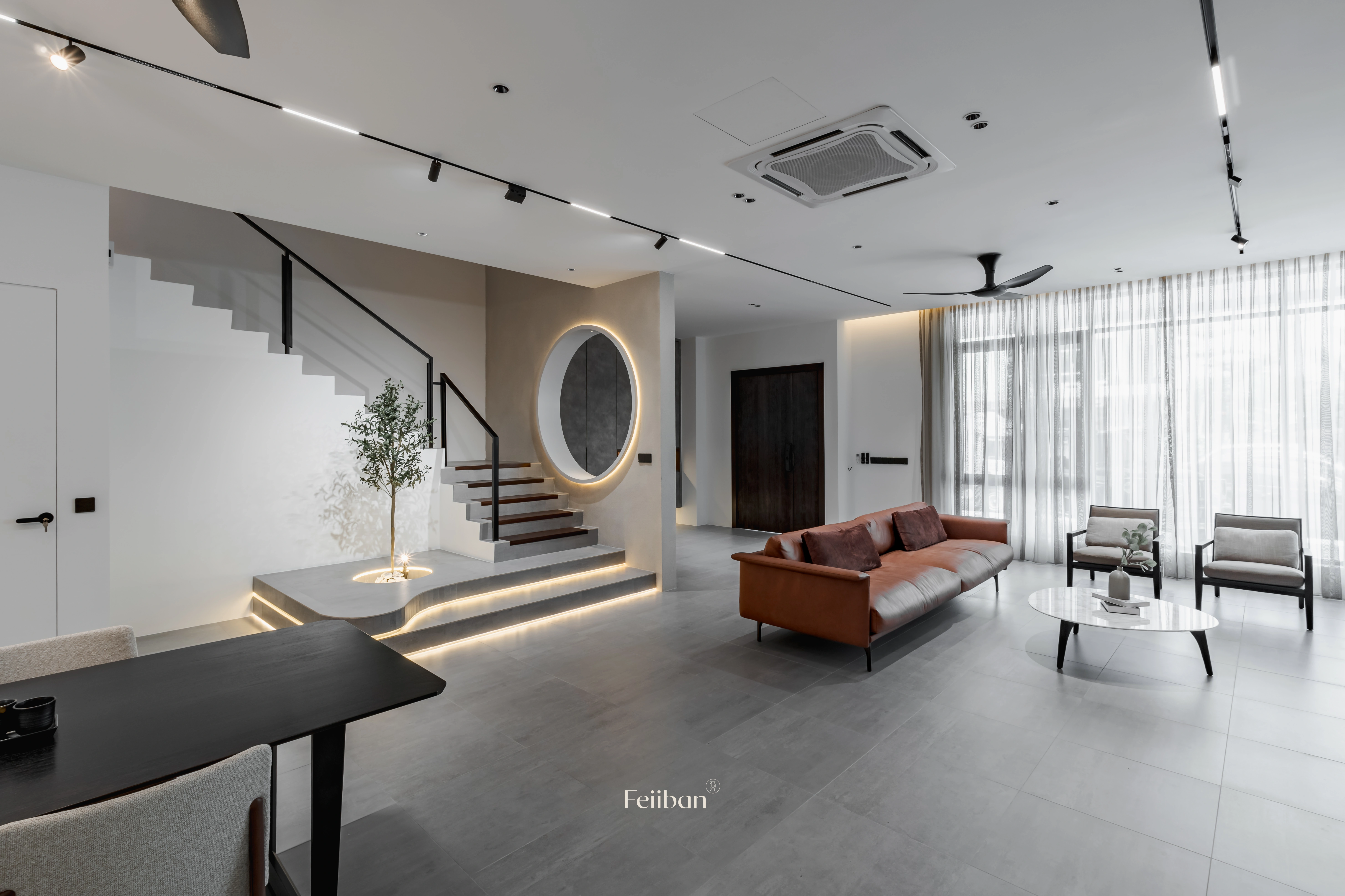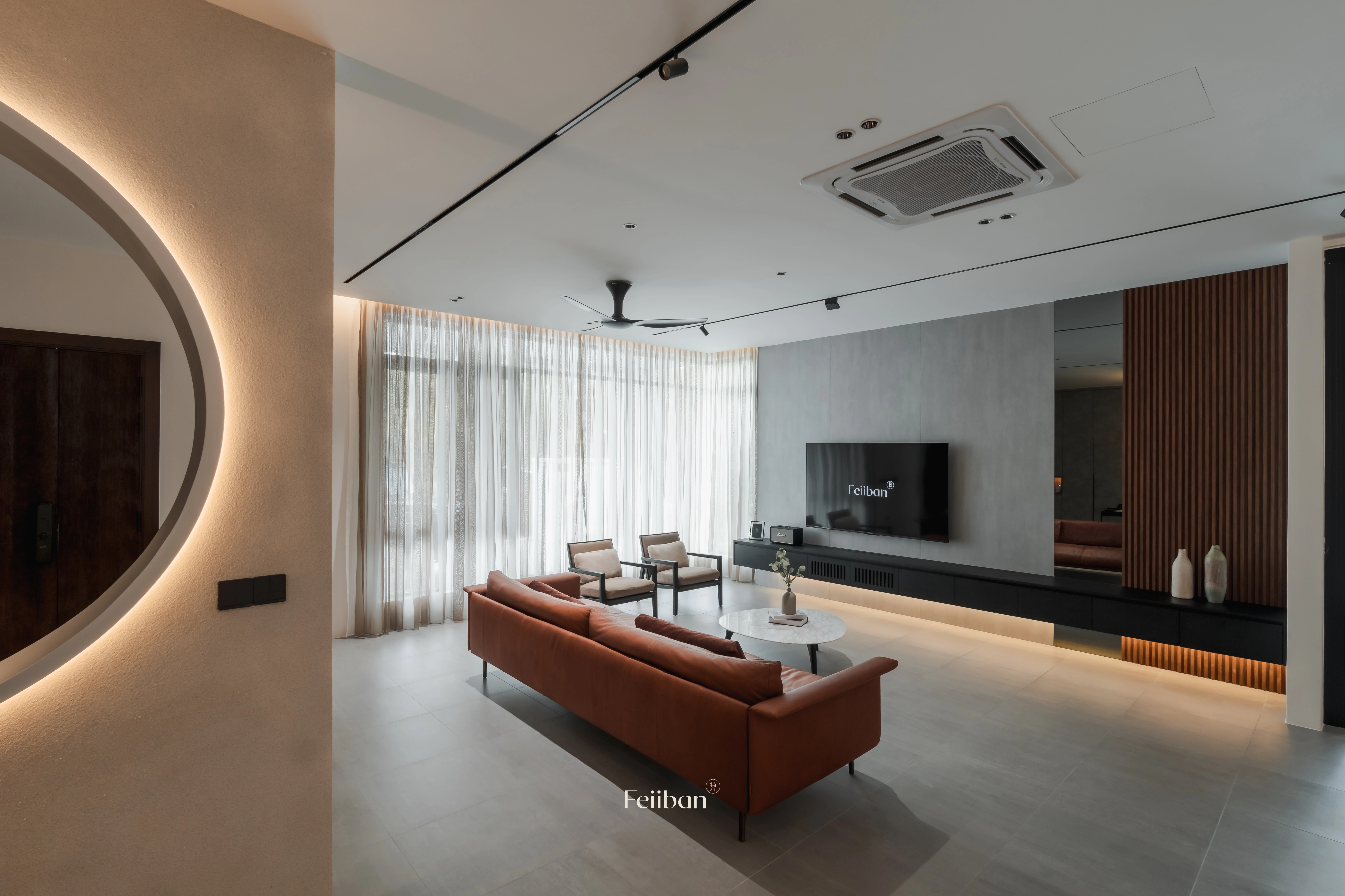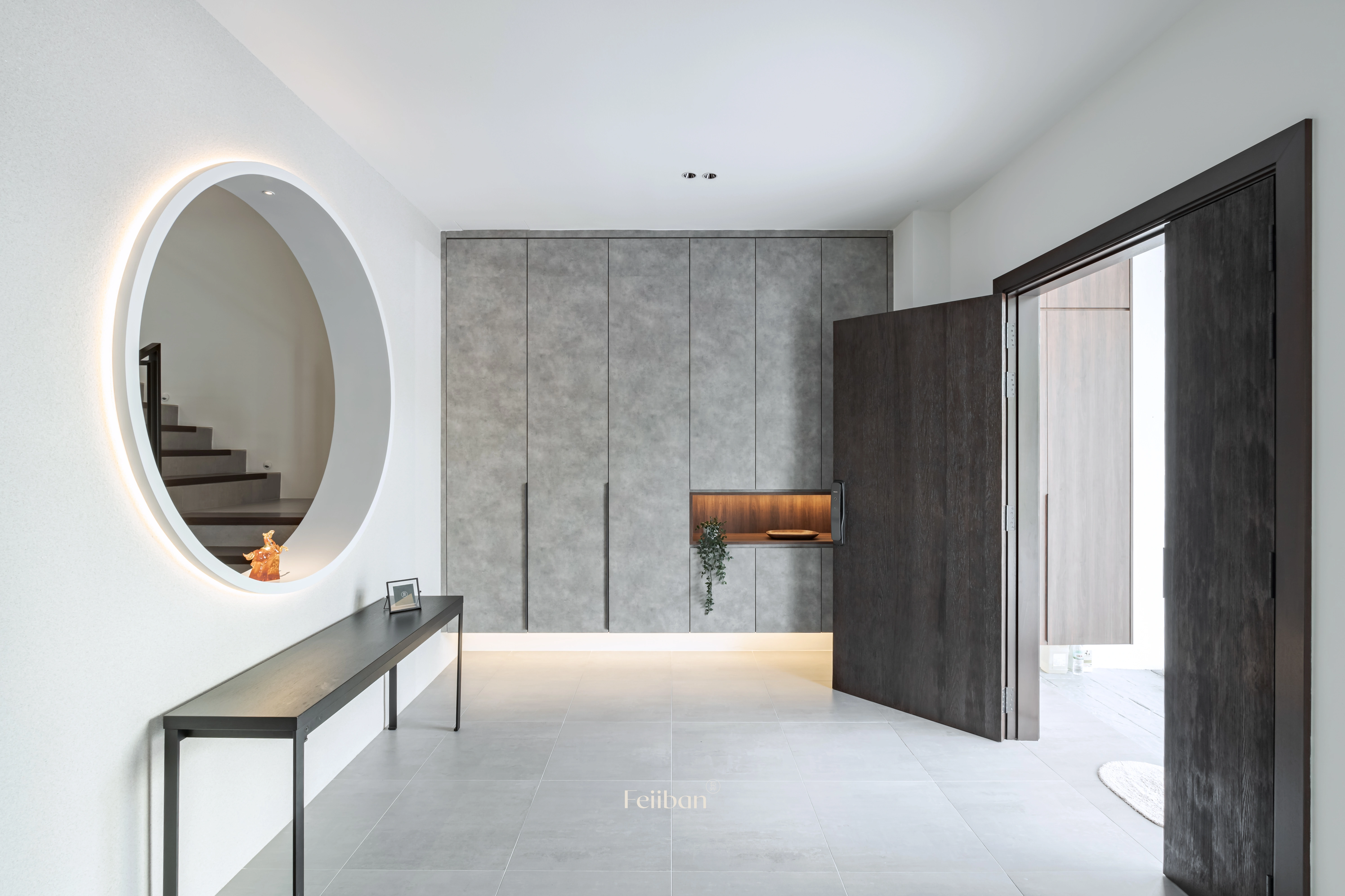 The hollowed-out circular design of the wall makes the space feel more spacious and airy, creating a visual focal point that enhances the beauty of layers.