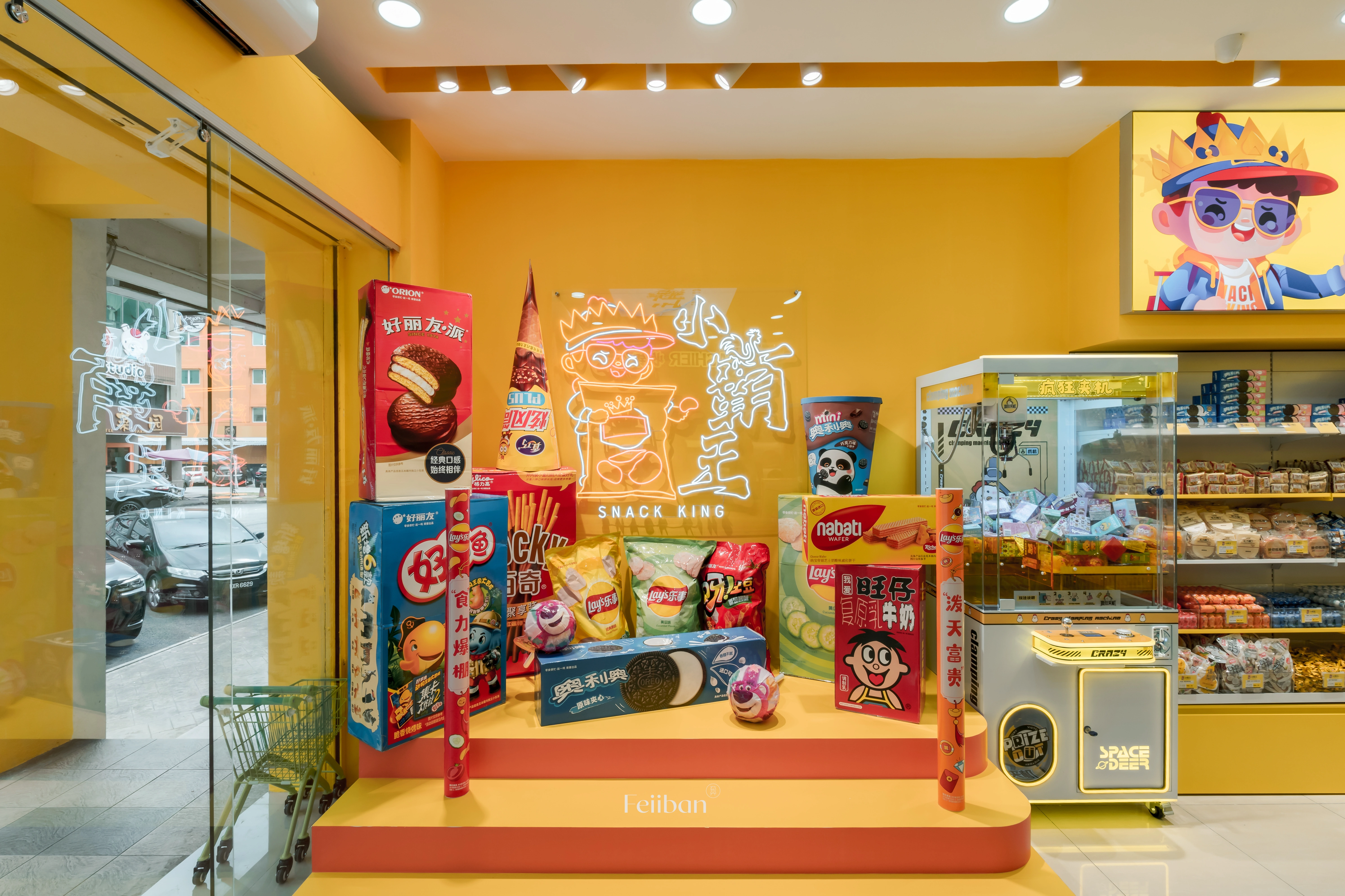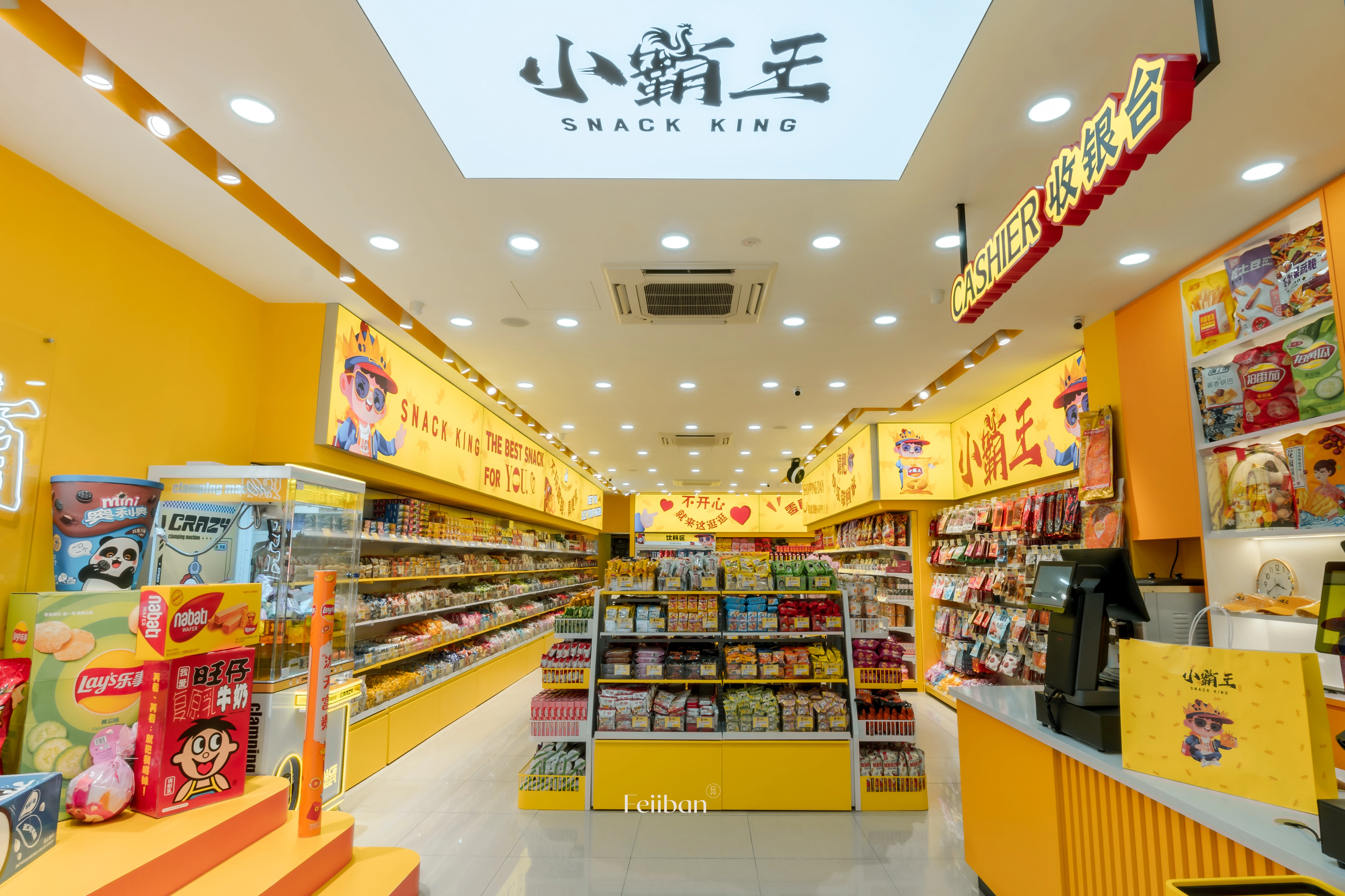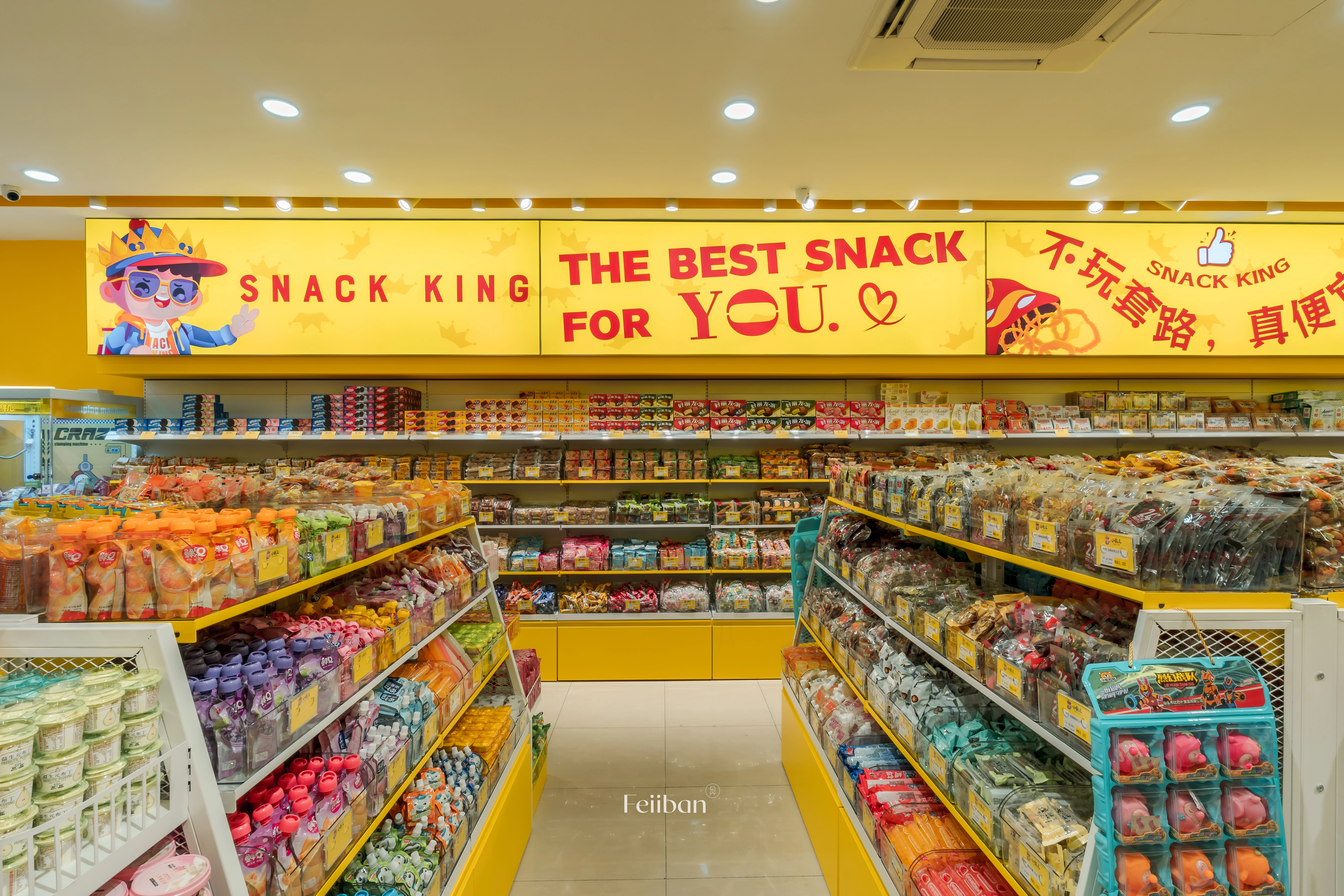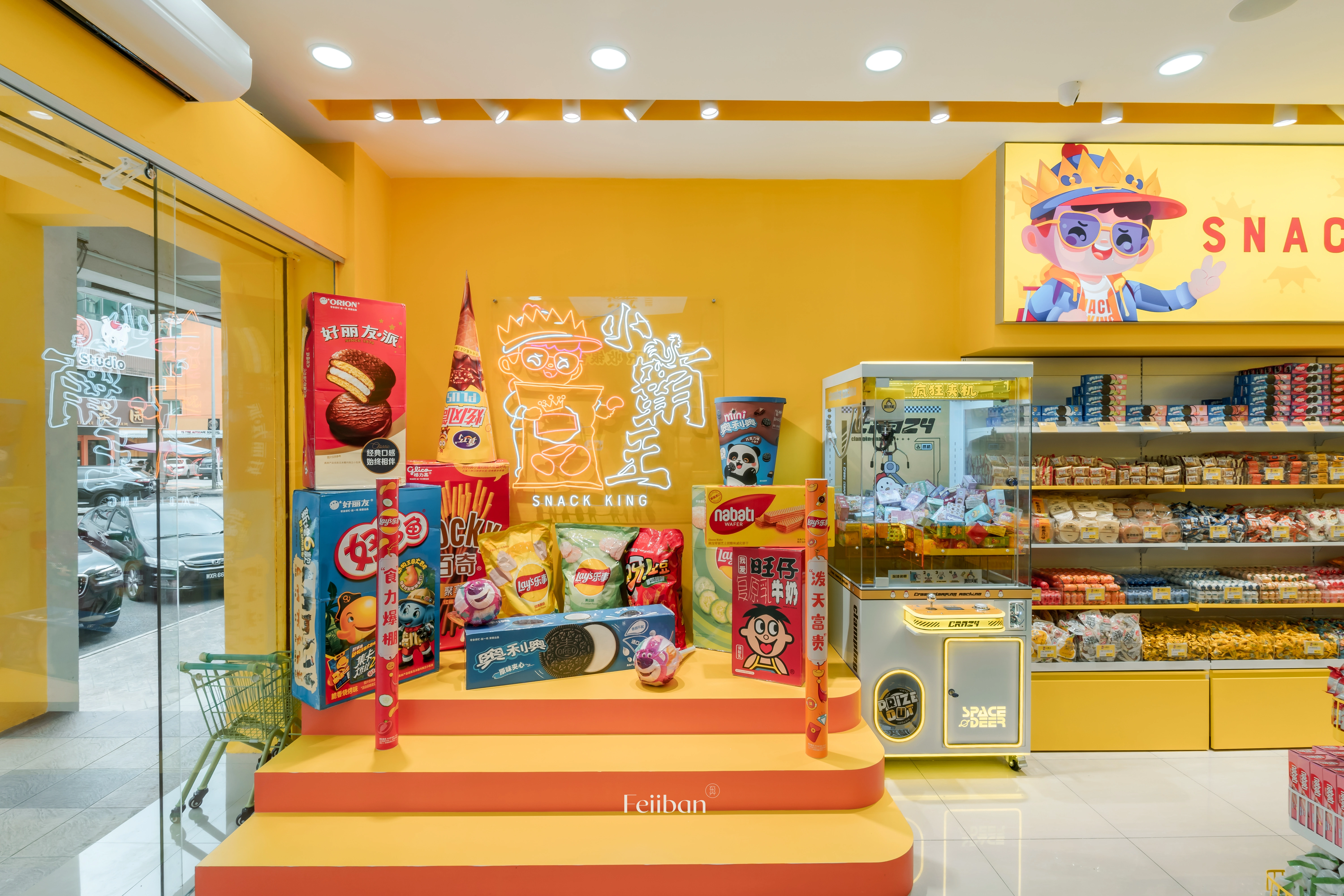 Step into Snack King, where vibrant yellow hues set the stage for a joyful and delicious experience! Designed to create a fun and inviting atmosphere, the store welcomes you with a mini stage featuring a glowing neon Snack King logo, the perfect photo spot for snack lovers.