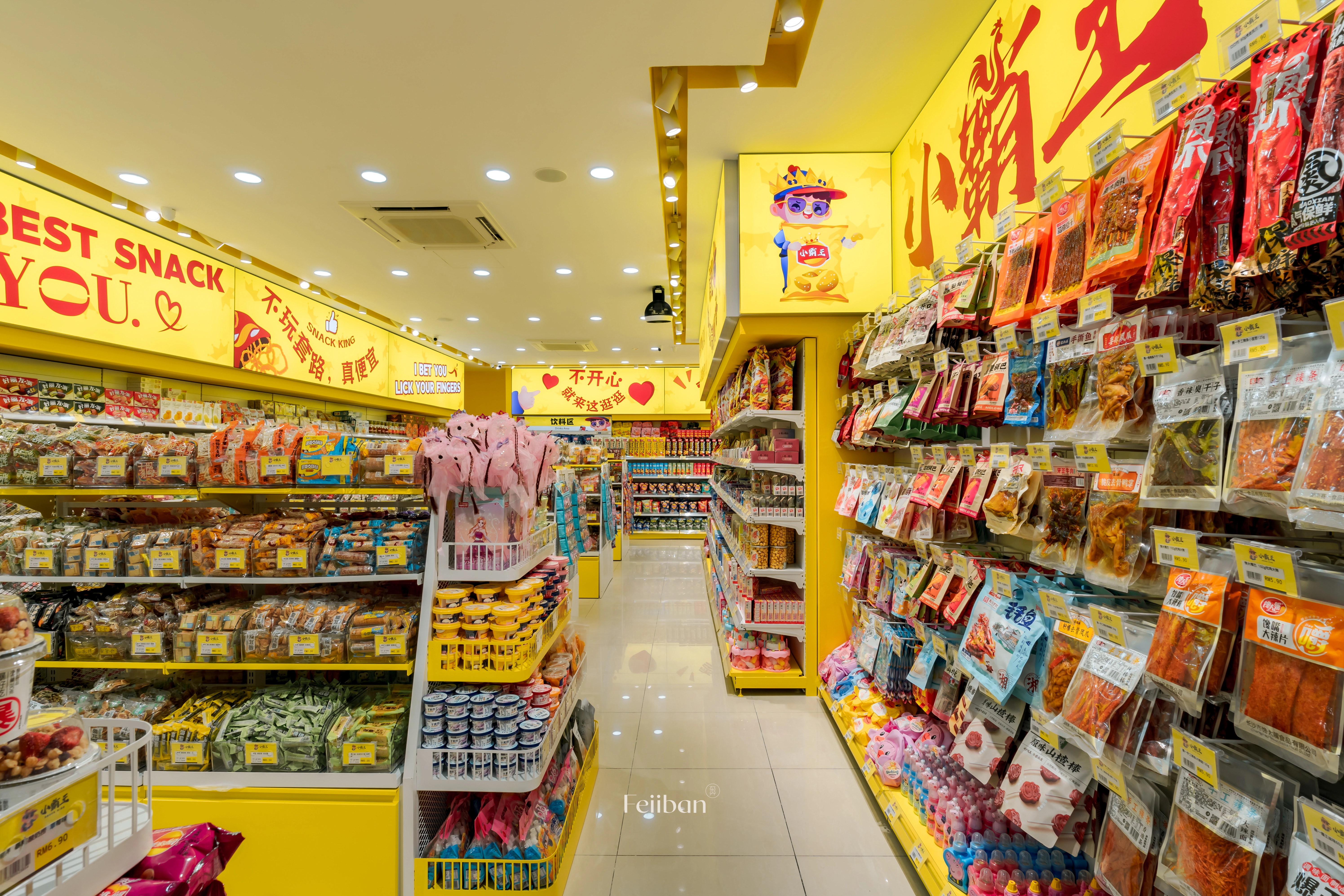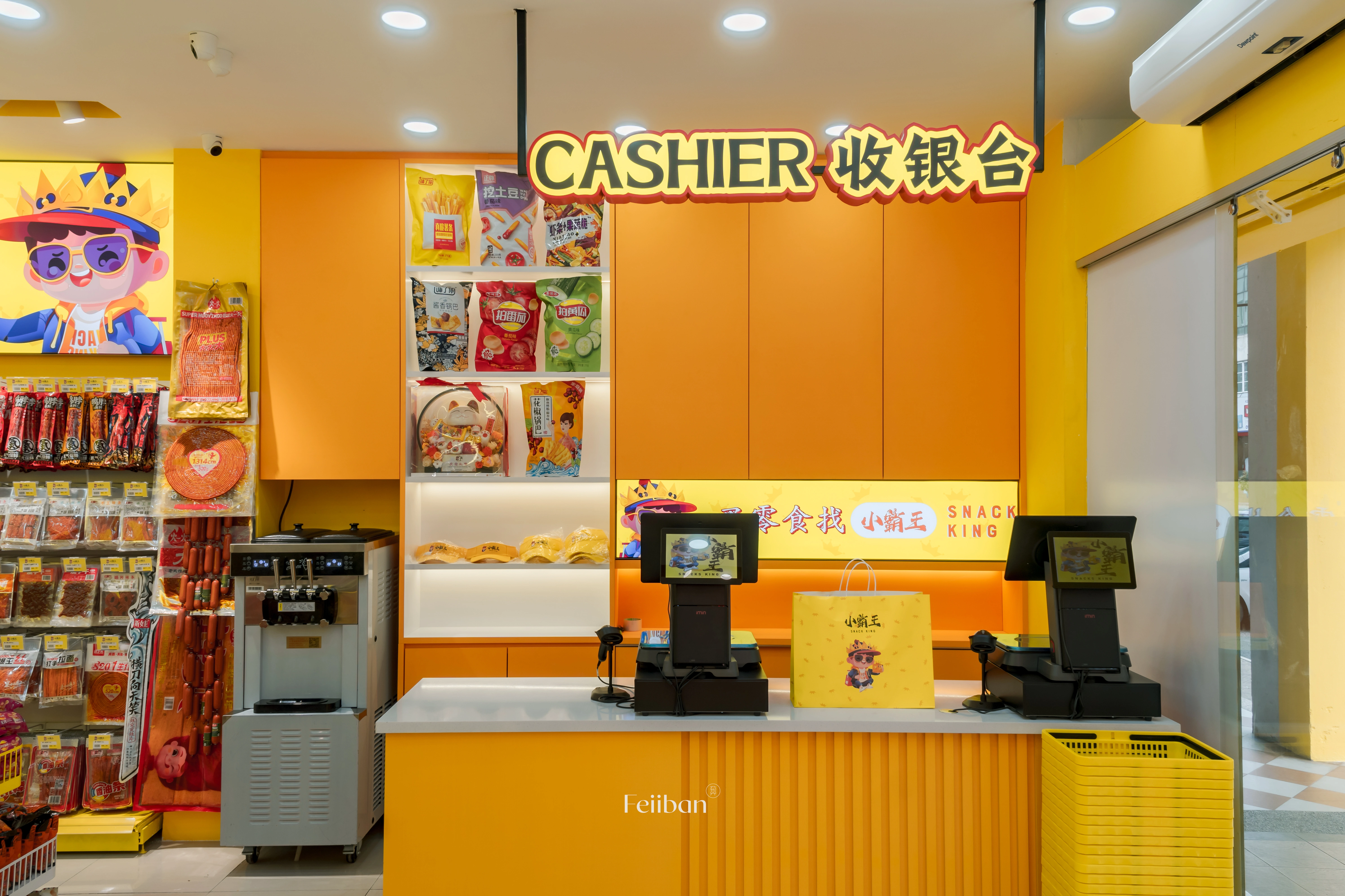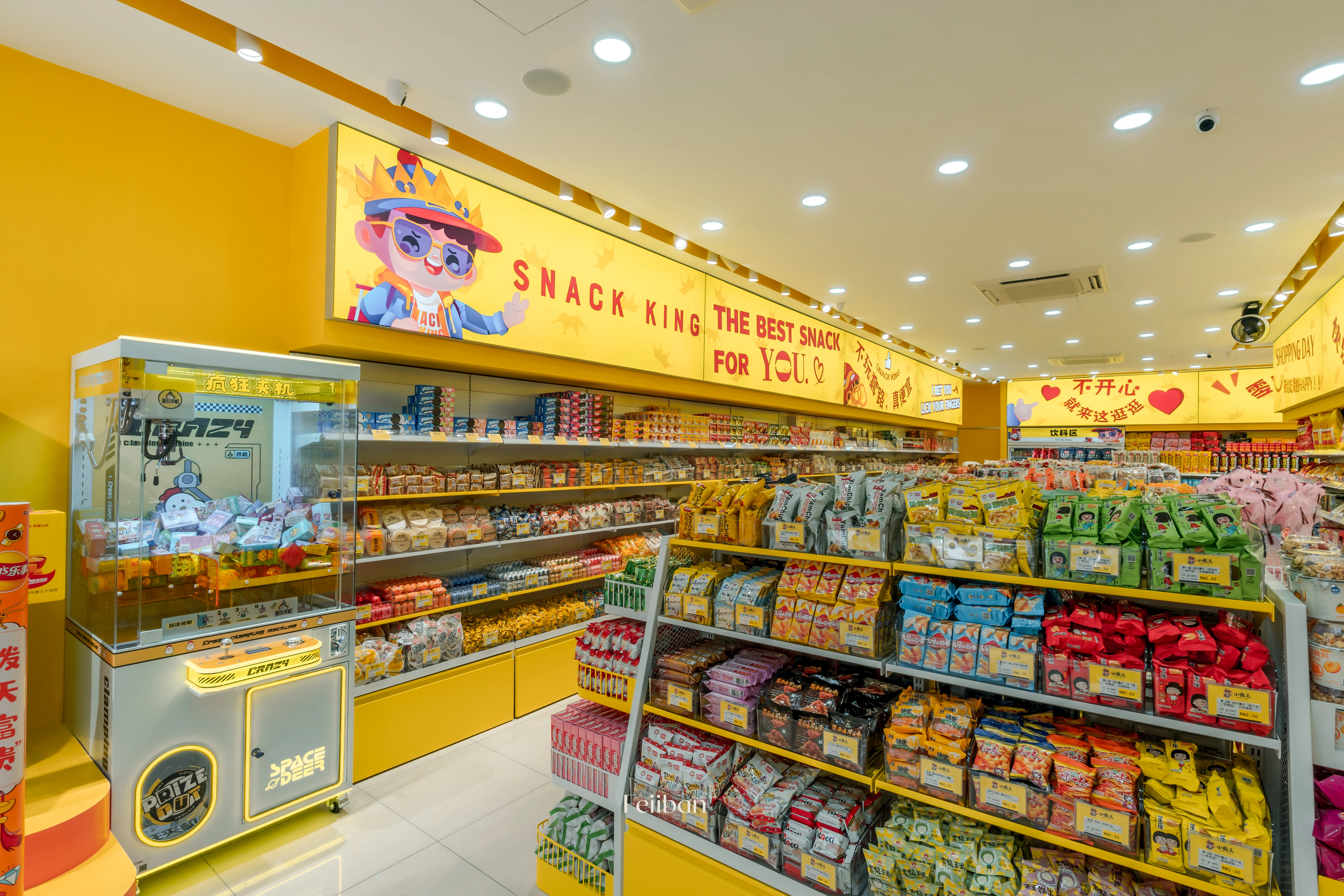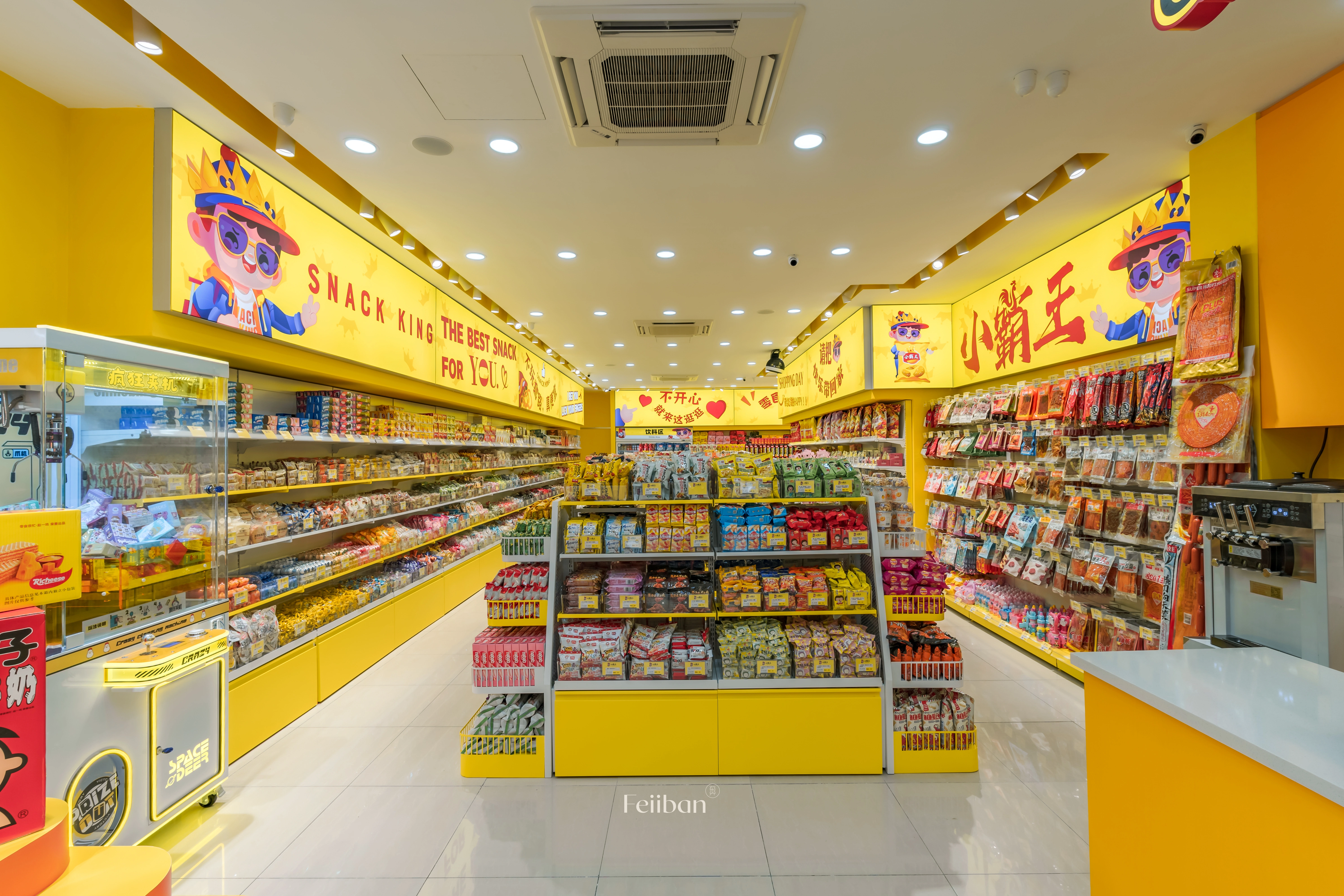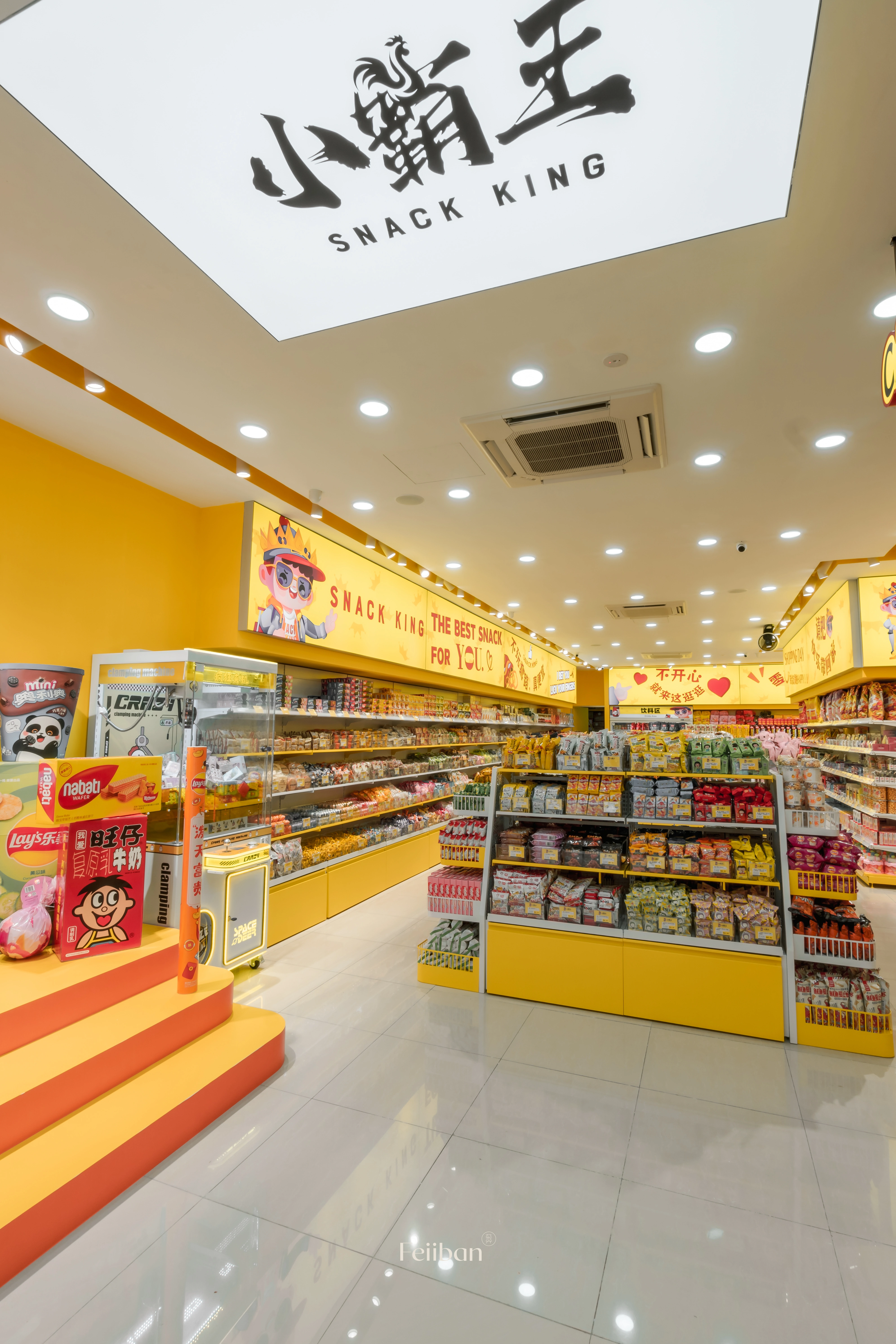 Step into Snack King, where vibrant yellow hues set the stage for a joyful and delicious experience! Designed to create a fun and inviting atmosphere, the store welcomes you with a mini stage featuring a glowing neon Snack King logo, the perfect photo spot for snack lovers.