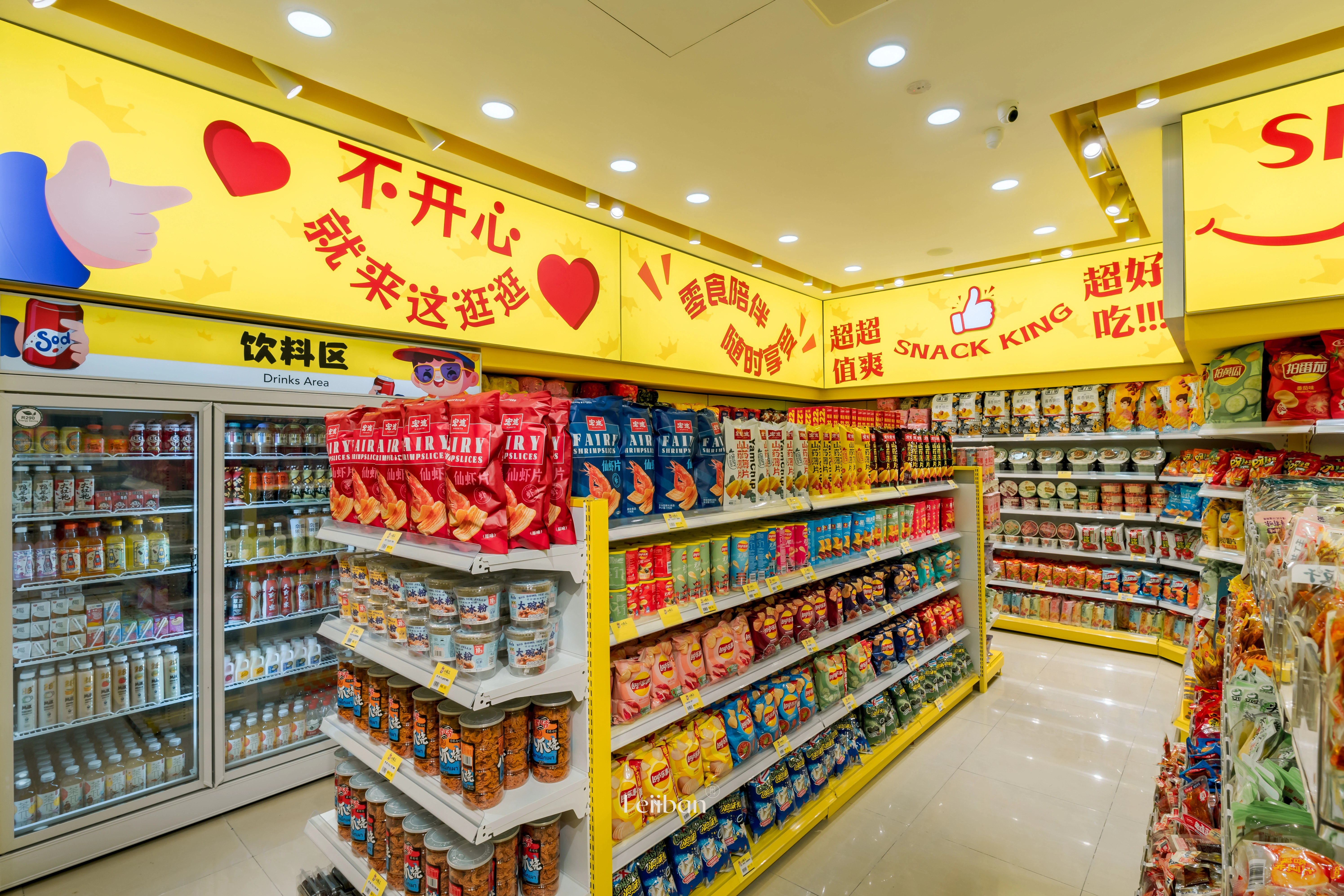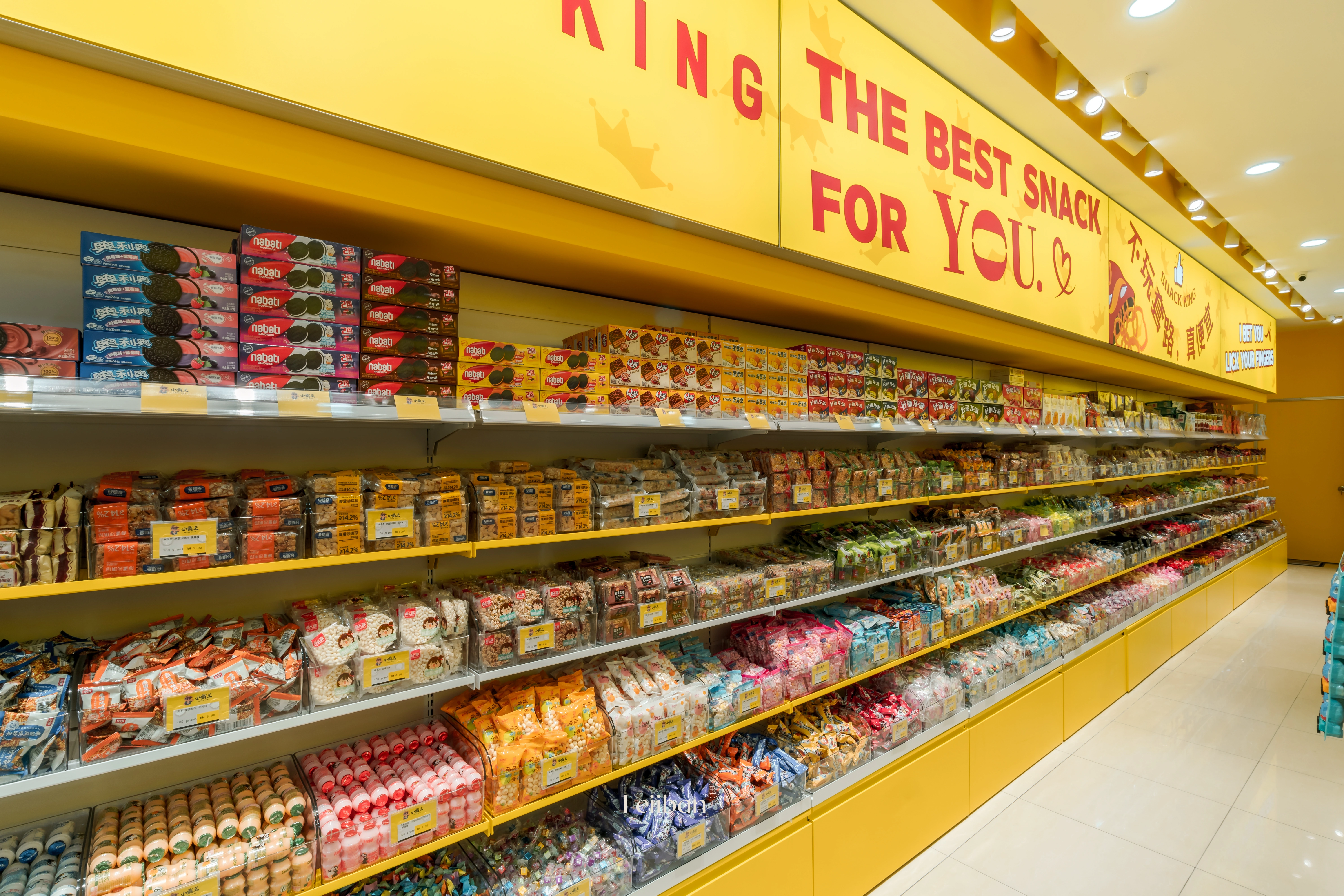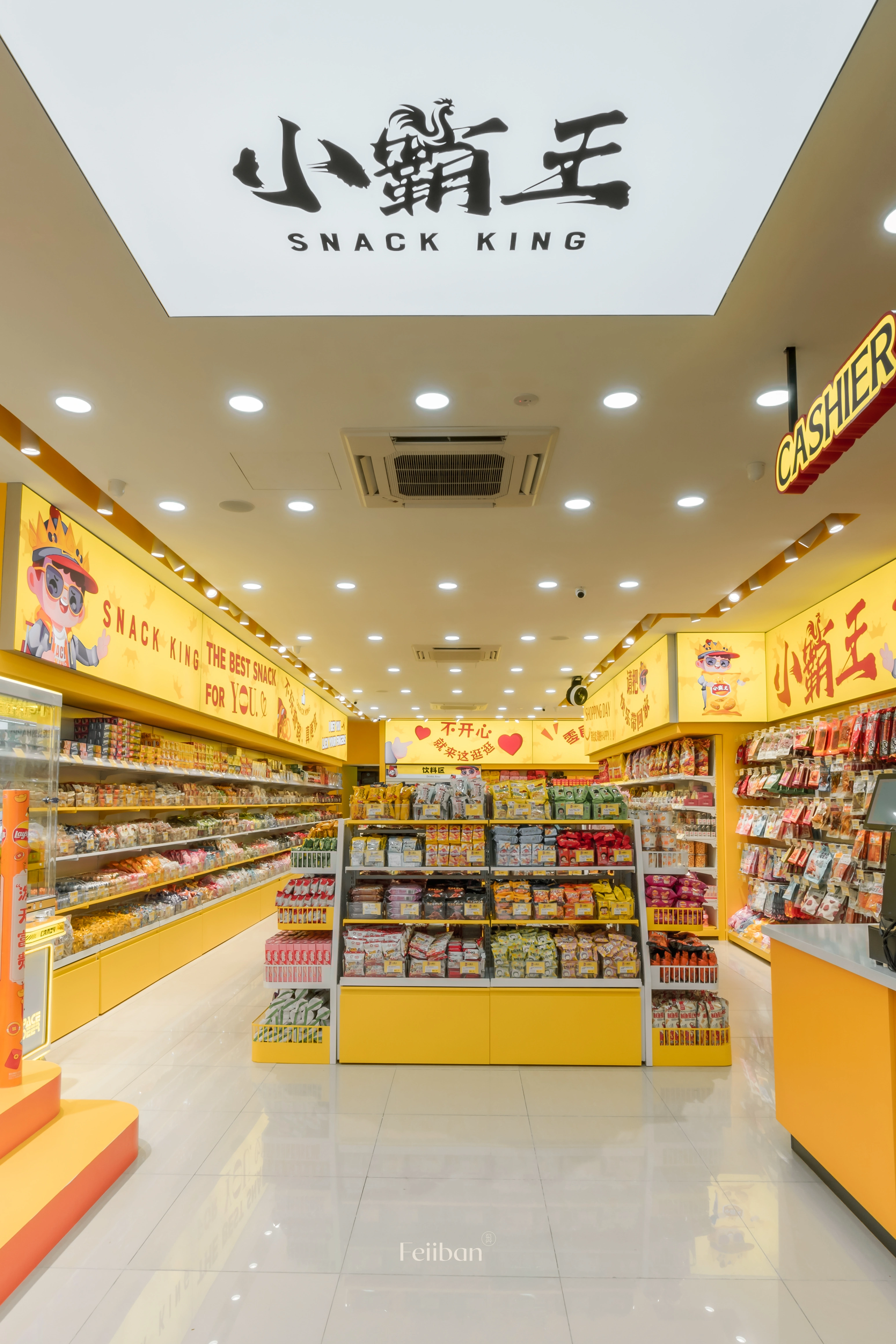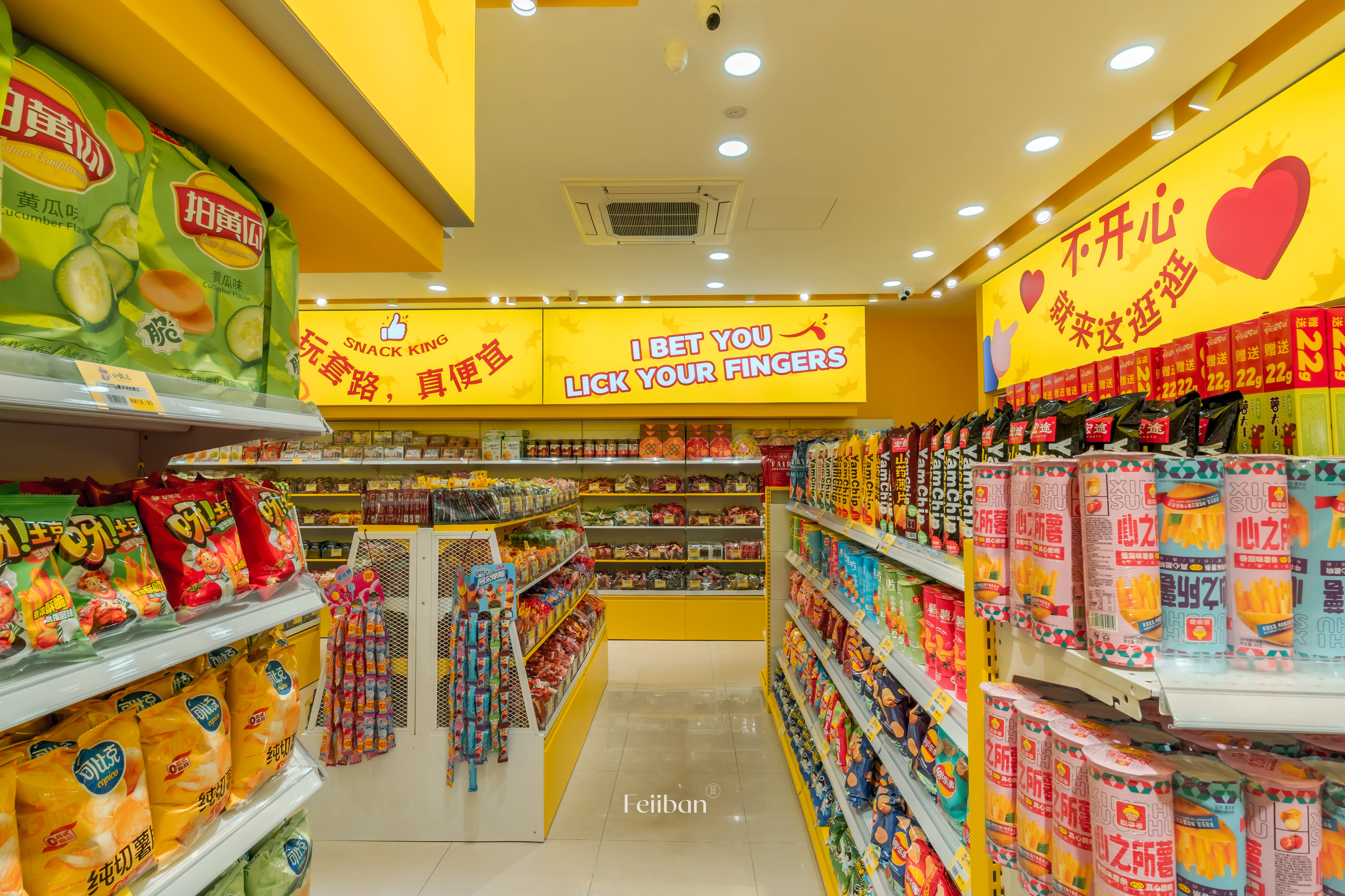 Step into Snack King, where vibrant yellow hues set the stage for a joyful and delicious experience! Designed to create a fun and inviting atmosphere, the store welcomes you with a mini stage featuring a glowing neon Snack King logo, the perfect photo spot for snack lovers.