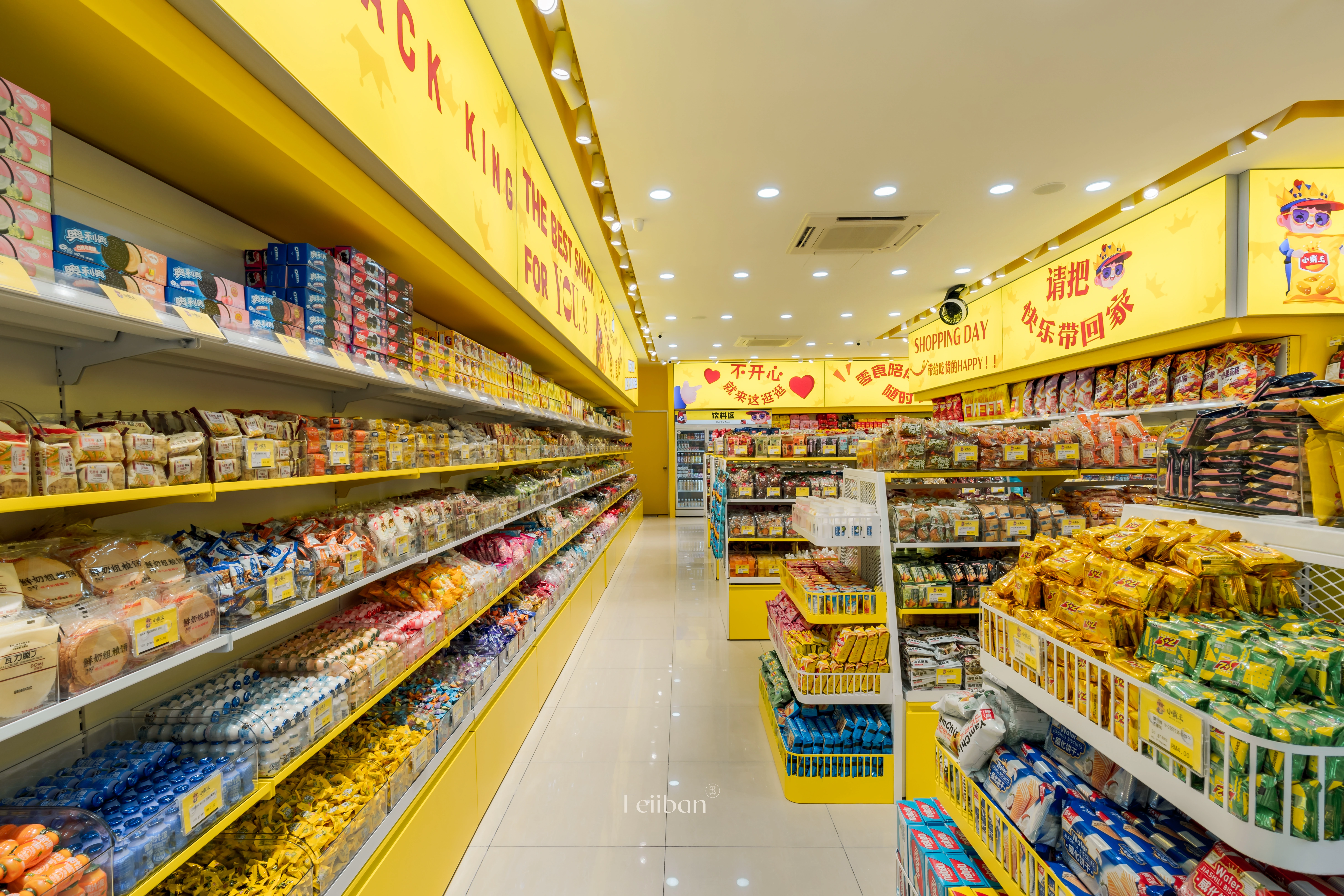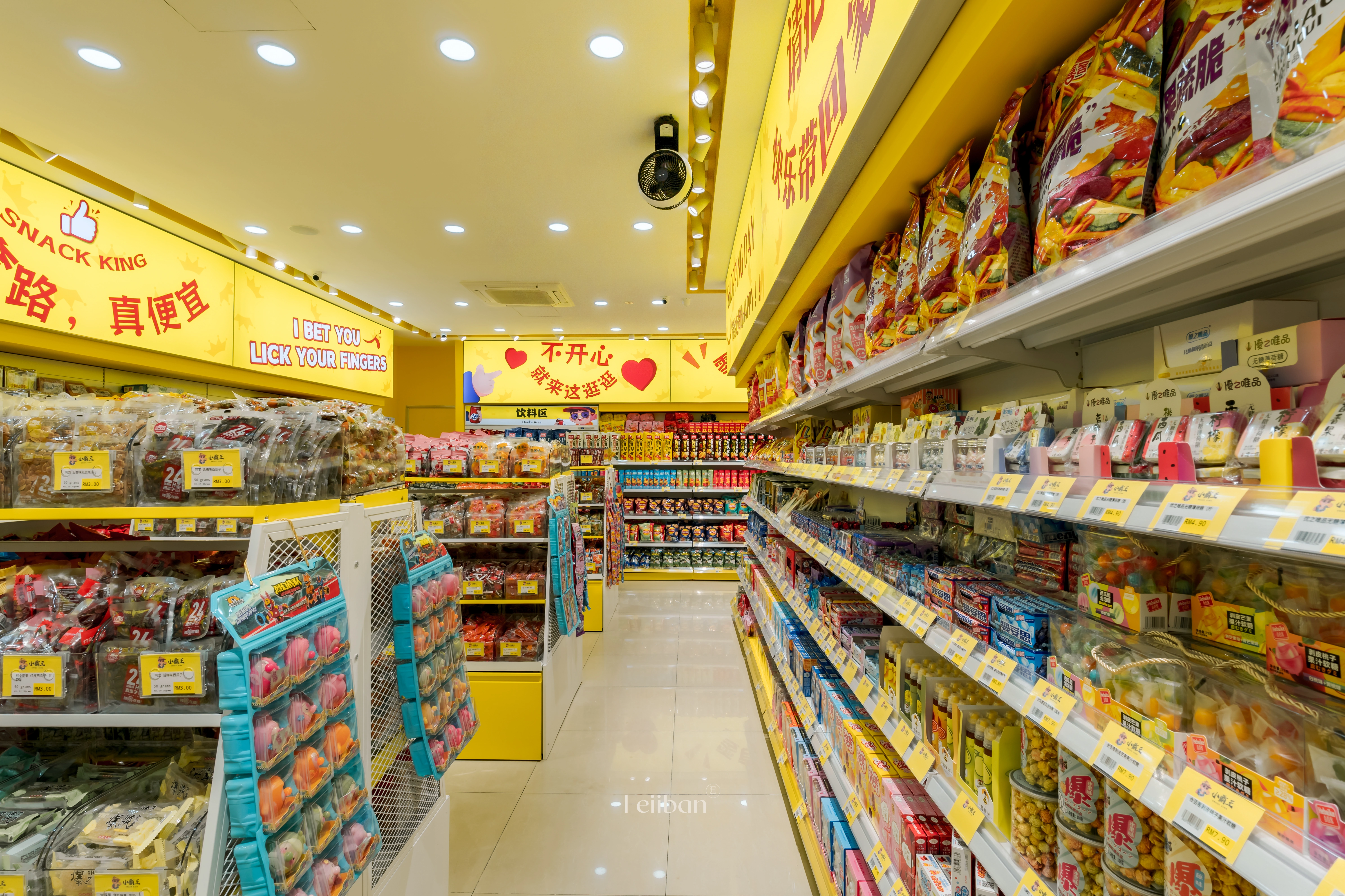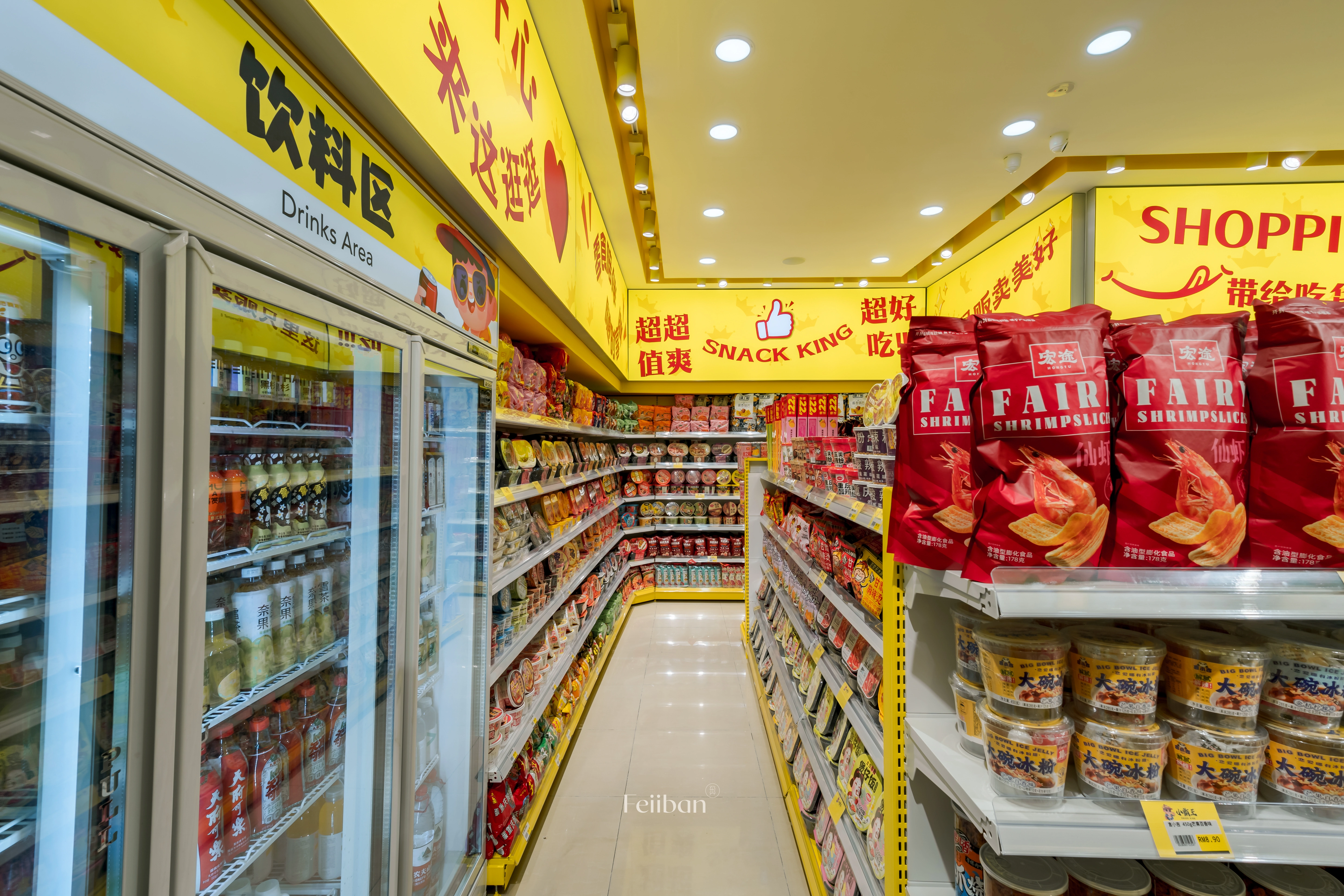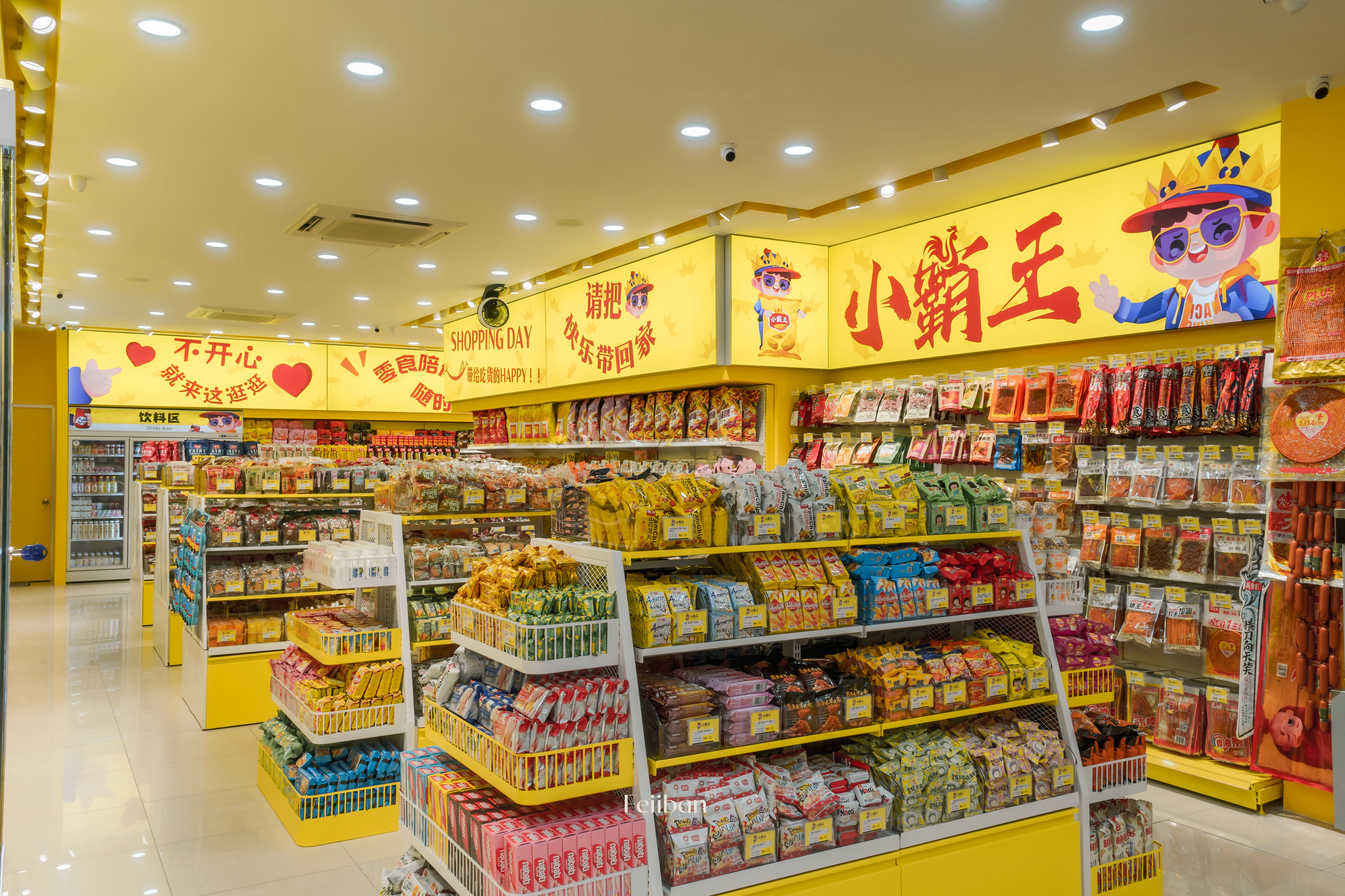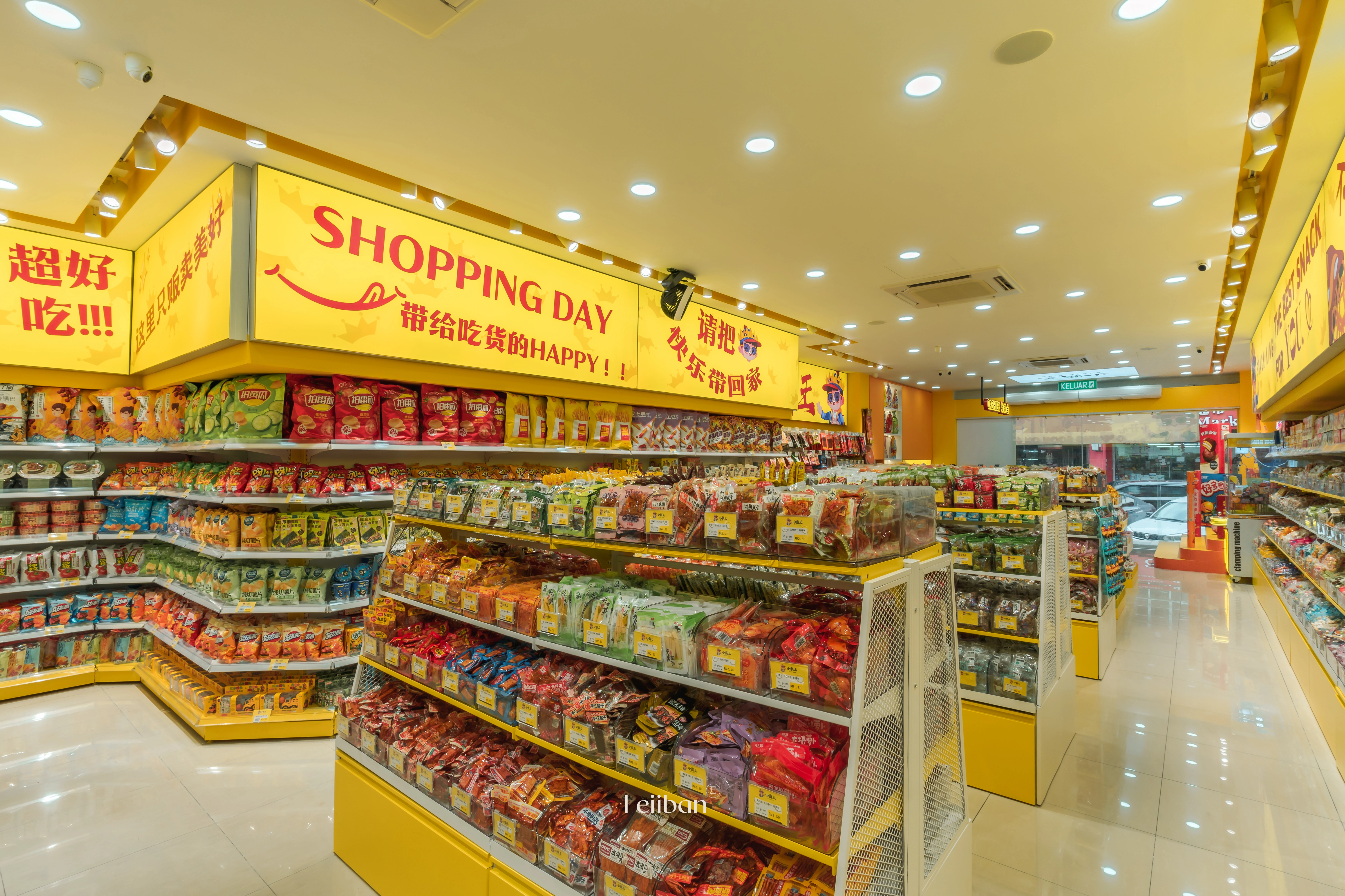 Overhead, a softbox ceiling light proudly displays the logo, while additional LED lightbox lights illuminate the snack racks with playful slogans, enhancing the excitement of discovering your favorite treats. This dynamic and immersive design ensures that every visit feels like a celebration of flavor and happiness!