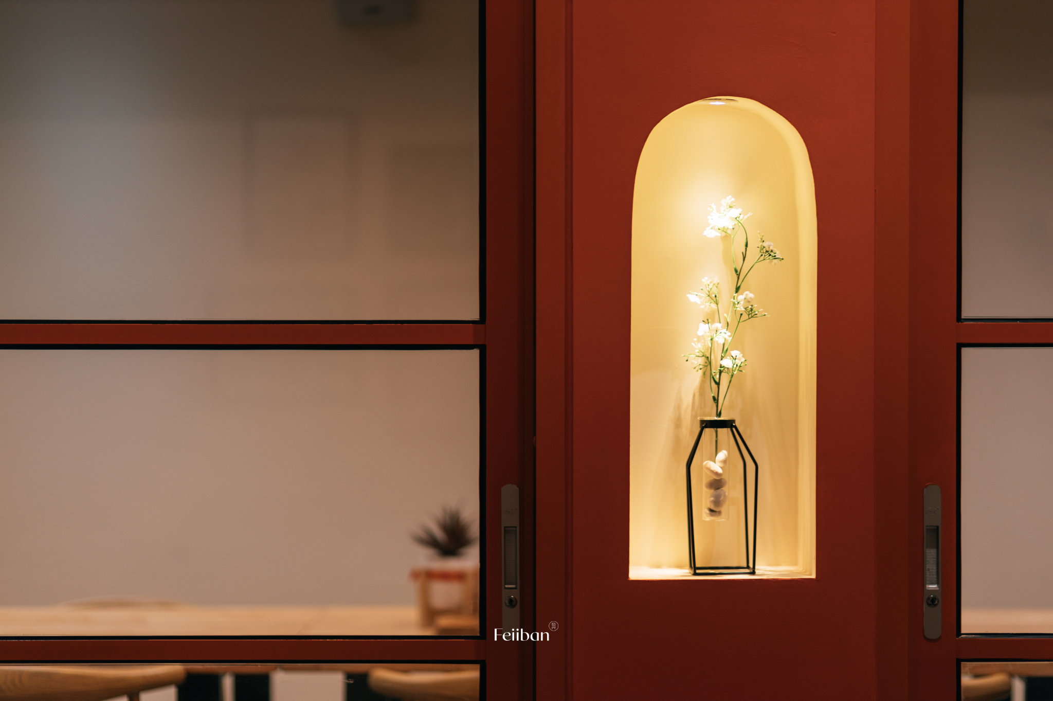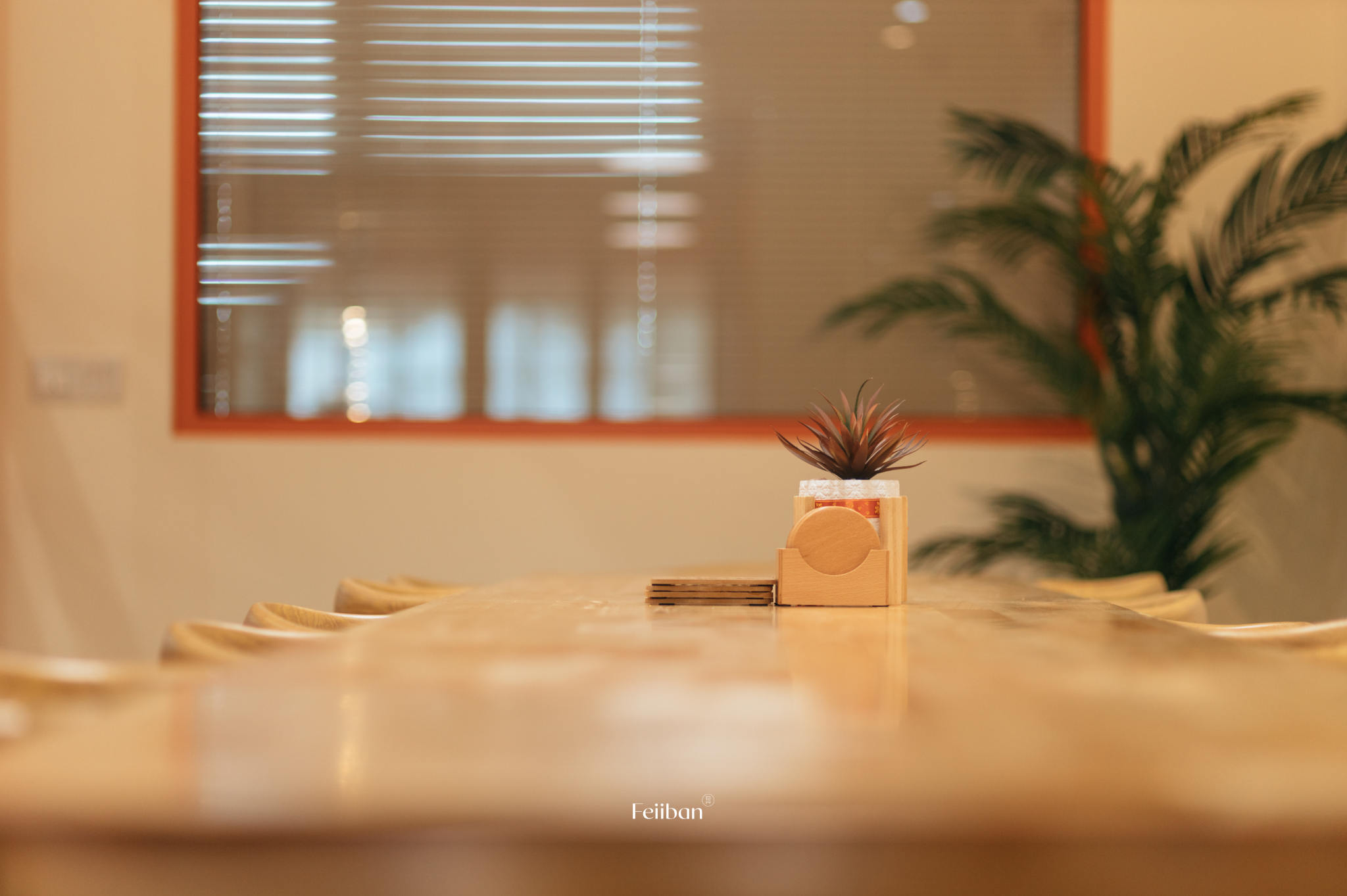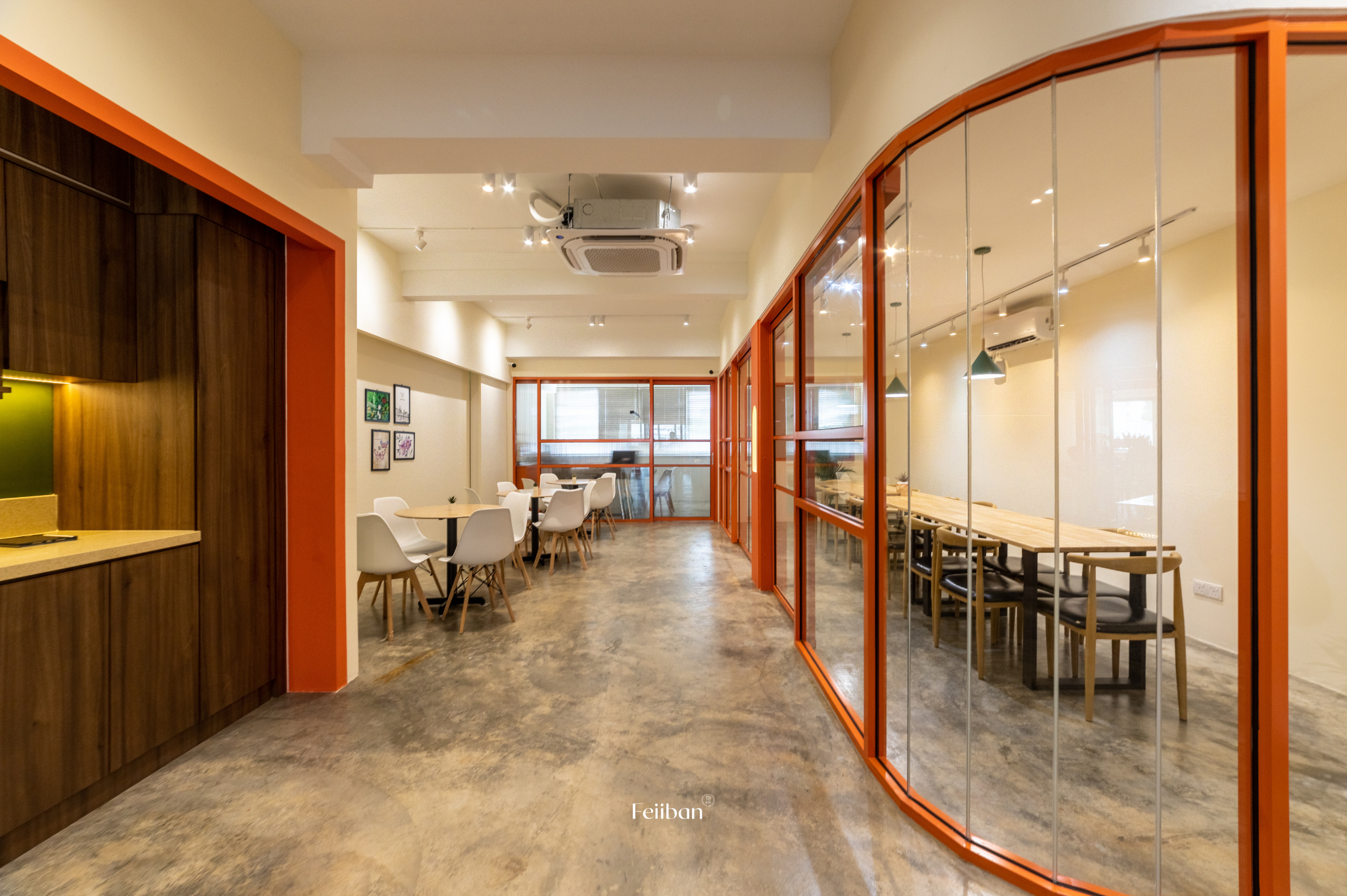 This office embraces a serene ambiance with a hint of Chinese elegance through the vibrant yet calming orange color scheme. The modern and minimalist furniture, along with natural elements like greenery and woodwork, creates a harmonious and inviting space.